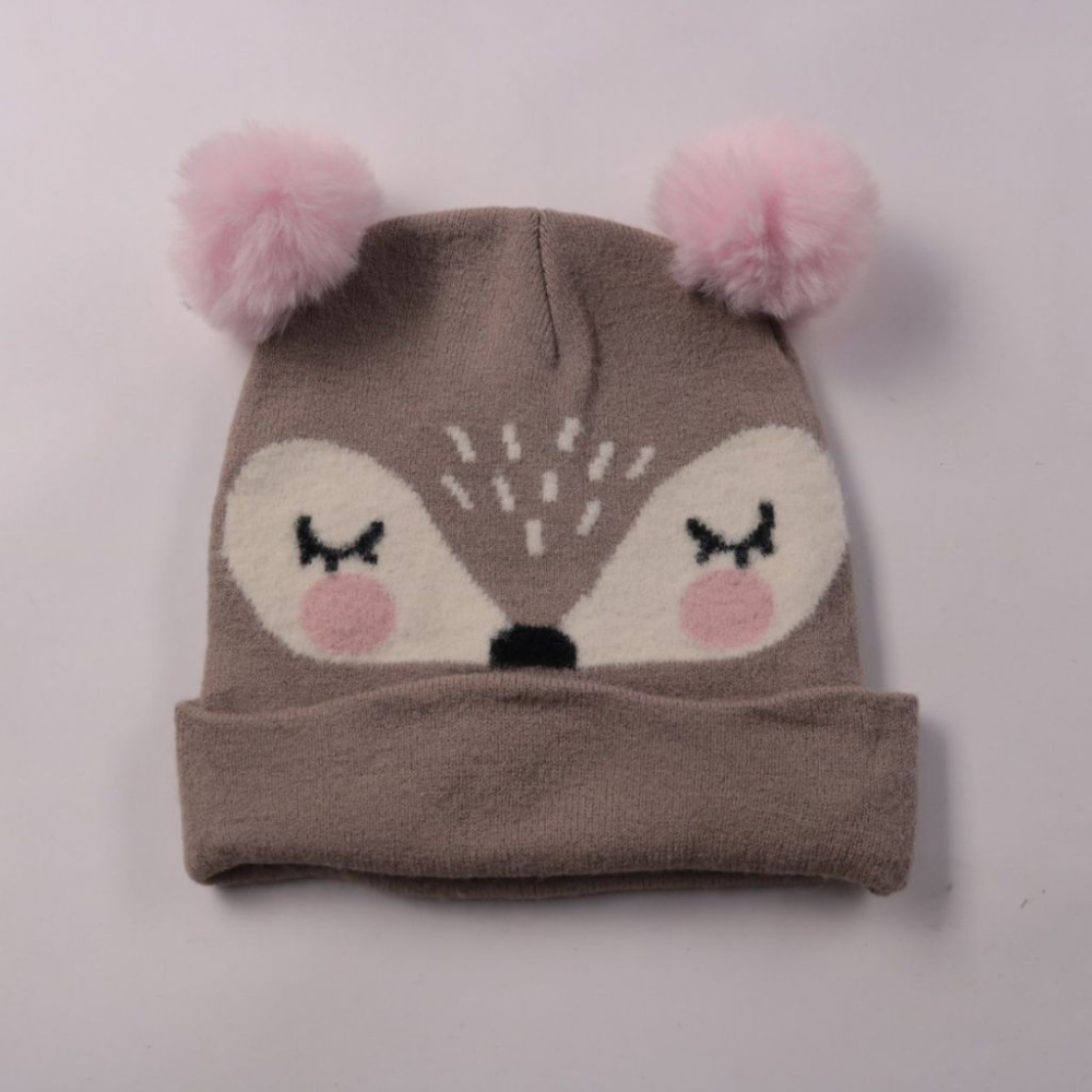 Детская вязаная шапка с ушками-помпонами и рисунком мордочки, подойдёт для прогулок в холодную погоду. Мягкая подкладка делает её тёплой и комфортной, а отворот лучше защищает лоб и уши. Удобно носить каждый день — легко сочетается с любой зимней одеждой.
