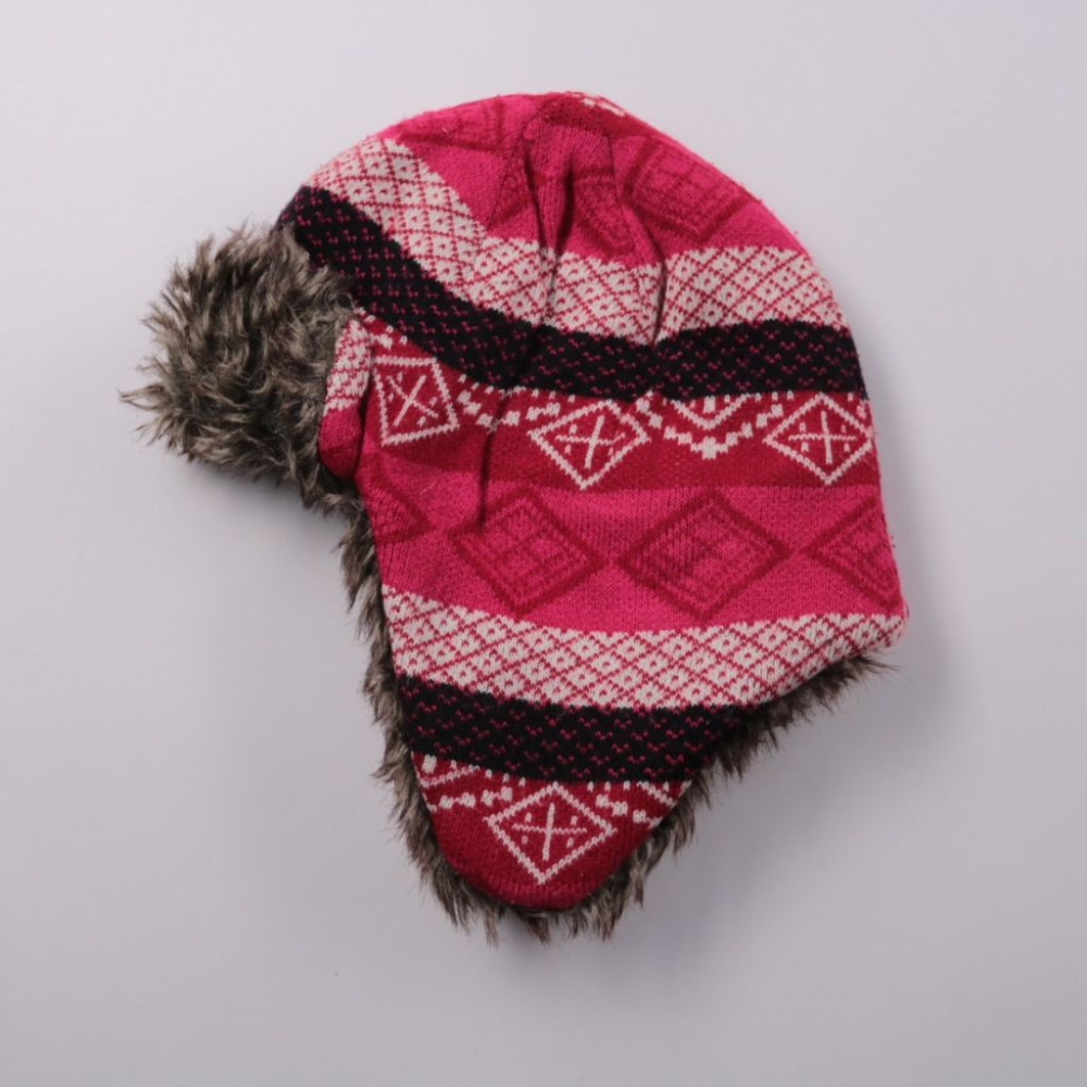 Вязаная шапка-ушанка с орнаментом и меховой отделкой. Подойдёт для холодной зимы и прогулок на улице. Уши хорошо закрываются и дополнительно защищают от ветра.
