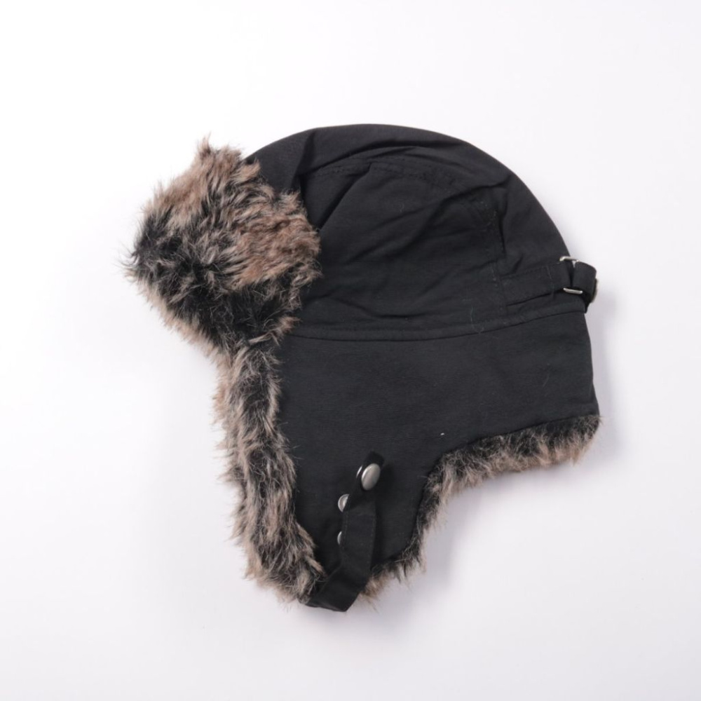 Зимняя шапка-ушанка H&M чёрного цвета с отделкой под мех и застёжкой под подбородком. Подойдёт для прогулок и активных поездок в холодную погоду, хорошо закрывает уши и затылок. Практична тем, что плотно фиксируется и не слетает от ветра.