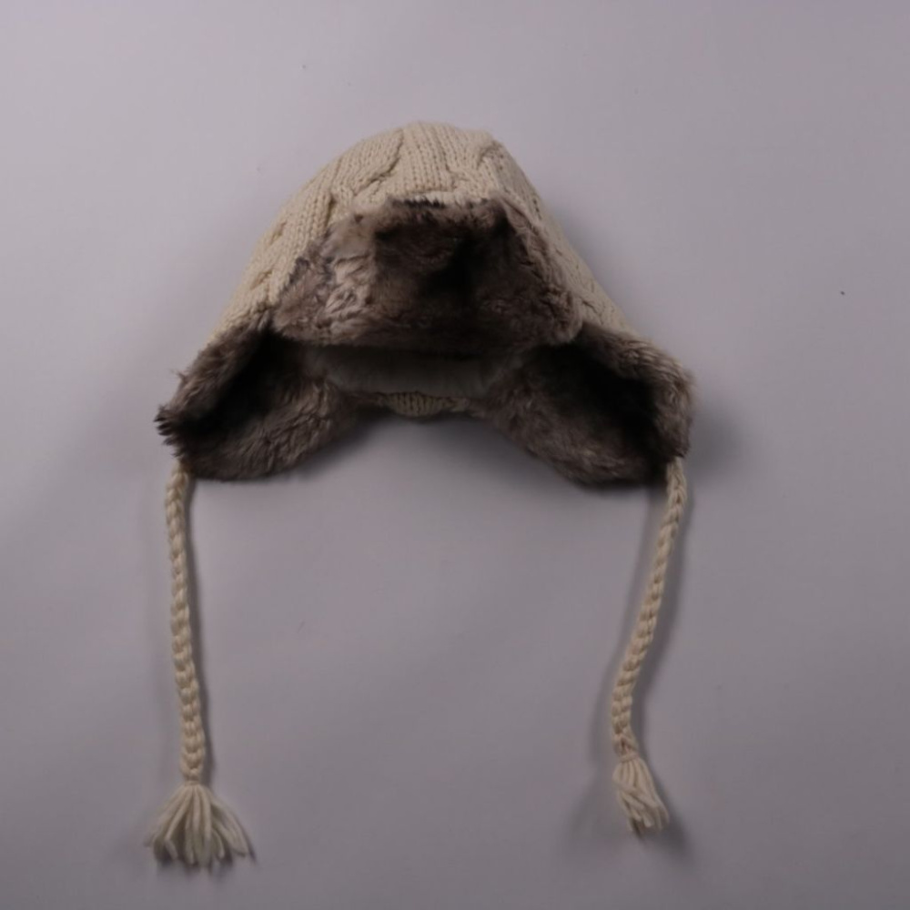 Вязаная шапка-ушанка H&M молочного цвета с завязками и отделкой из искусственного меха. Подойдёт для зимних прогулок и поездок, хорошо закрывает уши от ветра. Хлопковая подкладка делает носку комфортнее.