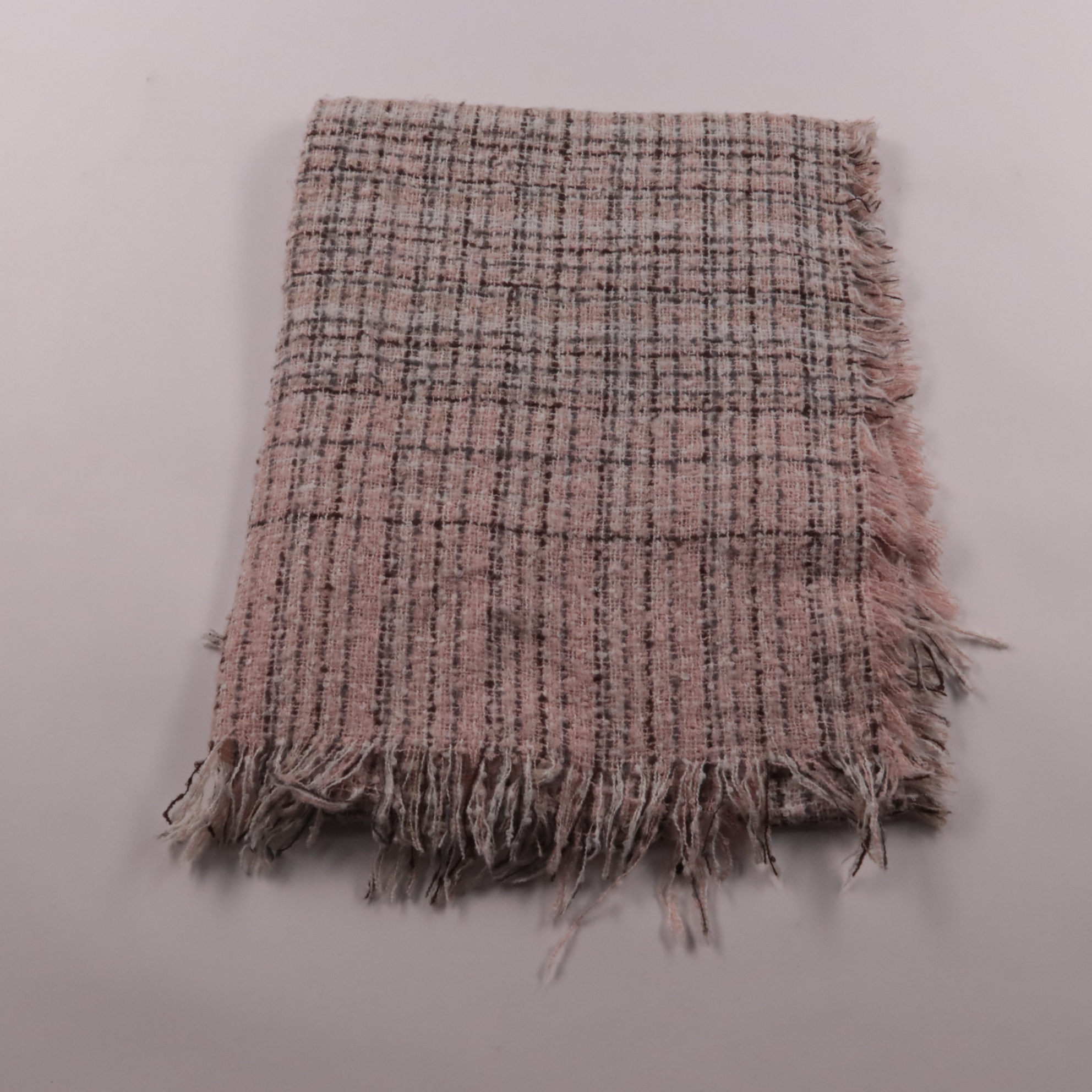 Шарф с бахромой из фактурной ткани «твид» в розово-сером меланже. Подойдёт для прохладной погоды и легко сочетается с пальто или курткой в базовых оттенках. Плотное плетение хорошо держит форму и добавляет тепла без лишнего объёма.