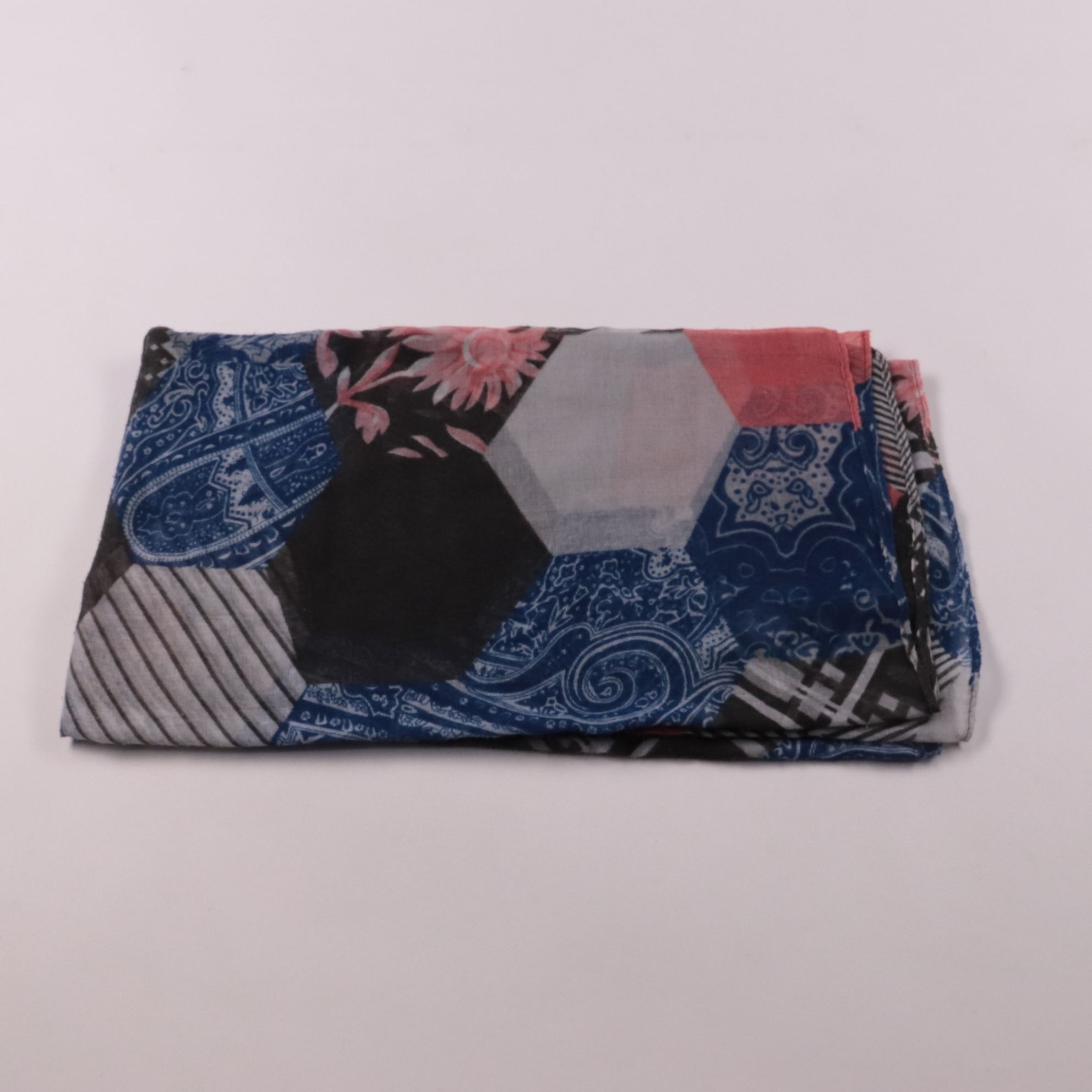 Лёгкий шарф с комбинированным принтом в сине-чёрно-красной гамме. Подойдёт для повседневных образов и как акцент к однотонной куртке или пальто. Тонкая ткань легко драпируется и удобно завязывается.