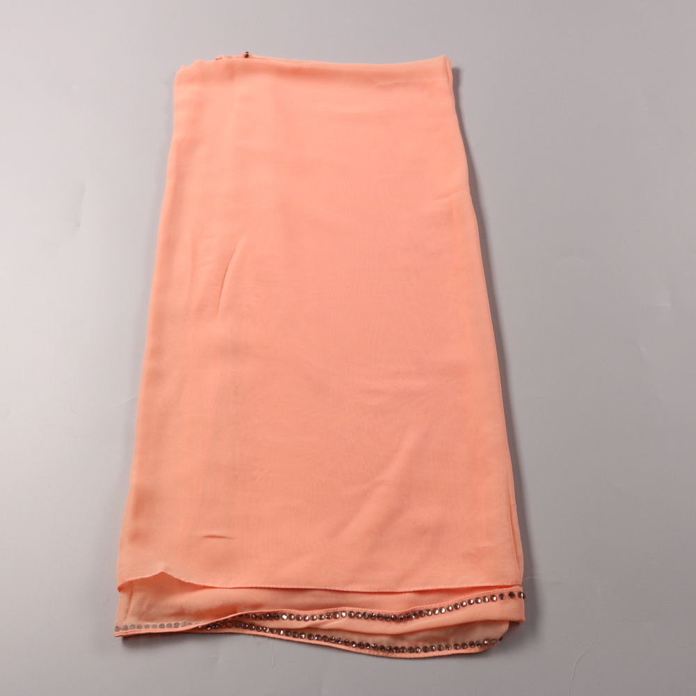 Лёгкий женский шарф персикового цвета с тонкой отделкой по краю. Подойдёт для весны и лета, а также как акцент к однотонным образам и платьям. Мягко драпируется и почти не занимает места в сумке.
