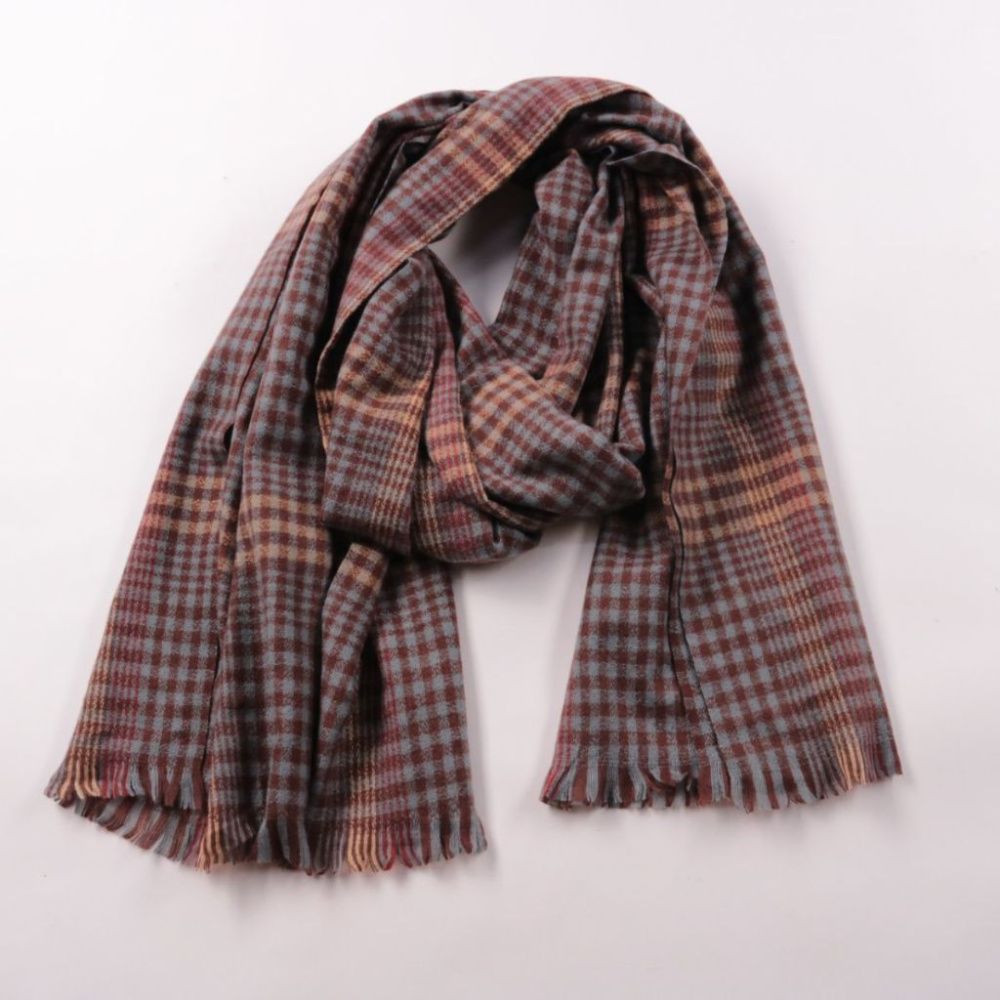 Шарф SIYA в клетку в спокойной серо-бордовой гамме с бахромой по краям. Подойдёт для повседневных образов и к пальто или куртке в прохладную погоду. Удобно драпируется и добавляет тепла без лишнего объёма.
