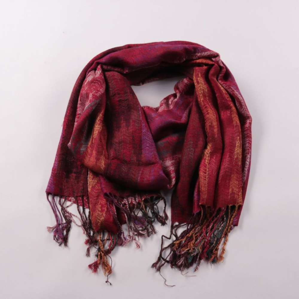Шарф с кисточками в бордовой гамме с многоцветным узором. Подойдёт для демисезона и прохладных вечеров, хорошо сочетается с однотонной верхней одеждой. Лёгкий и удобно драпируется, добавляя акцент в образ.