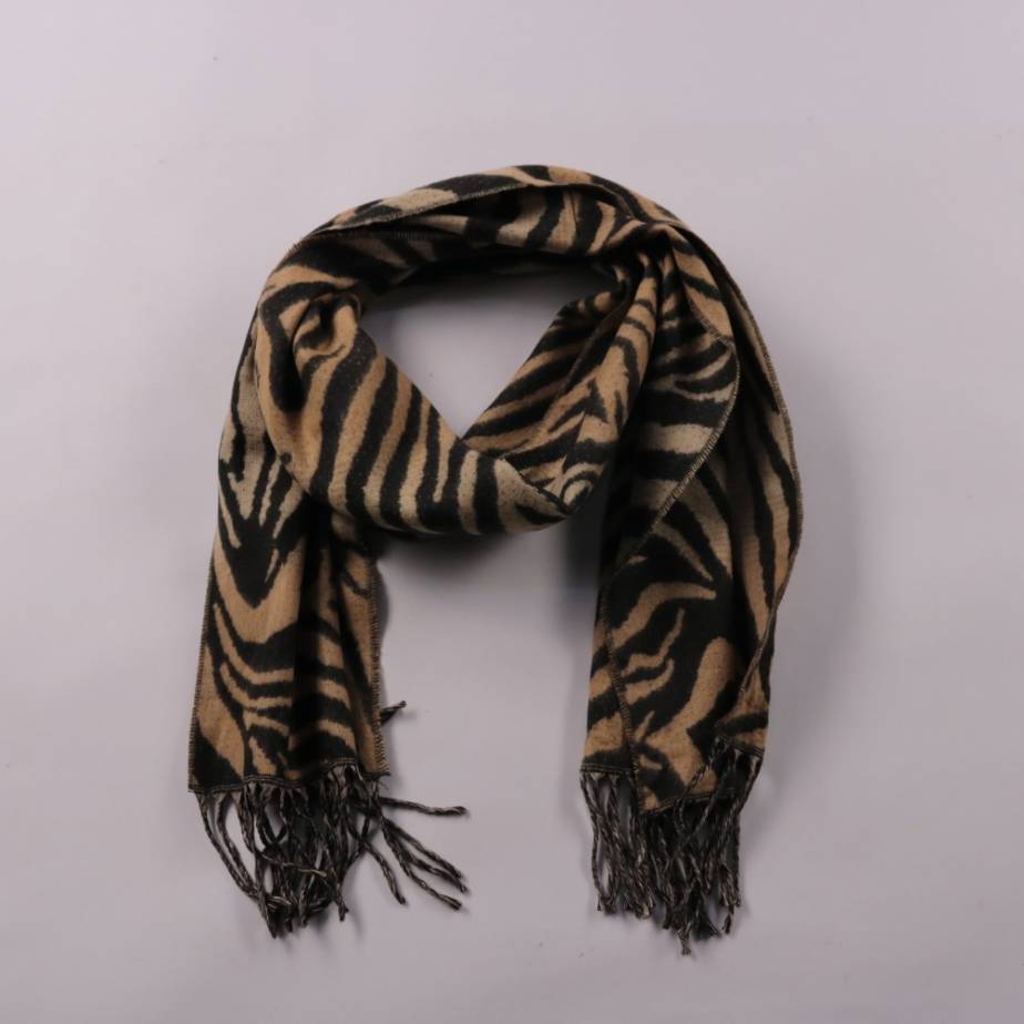 Шарф с анималистичным (зебра) принтом в бежево-чёрной гамме и с бахромой по краям. Подойдёт для демисезонных образов и прохладных вечеров, легко сочетается с однотонной верхней одеждой. Практичное преимущество — добавляет тепла и служит ярким акцентом ...