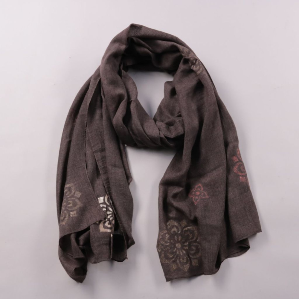 Шарф тёмно-серого цвета с ненавязчивым цветочным принтом. Подойдёт для повседневных образов и на прохладную погоду в межсезонье. Лёгкий материал удобно драпируется и не занимает много места в сумке.