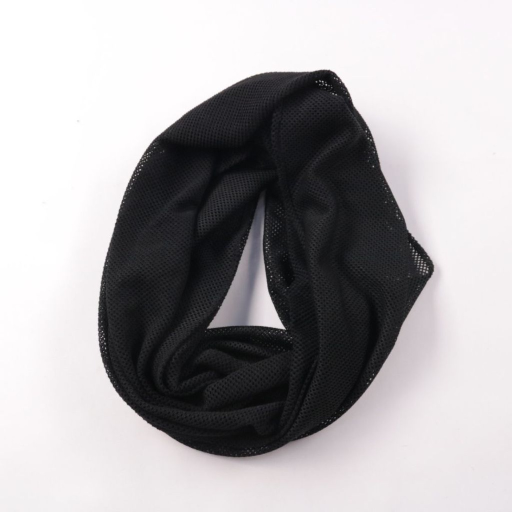 Чёрный шарф-снуд из тонкой сетчатой ткани без указанного бренда. Подойдёт как лёгкий аксессуар на каждый день или для спорта, не перегружает образ. Практичен тем, что компактно складывается и быстро сохнет.