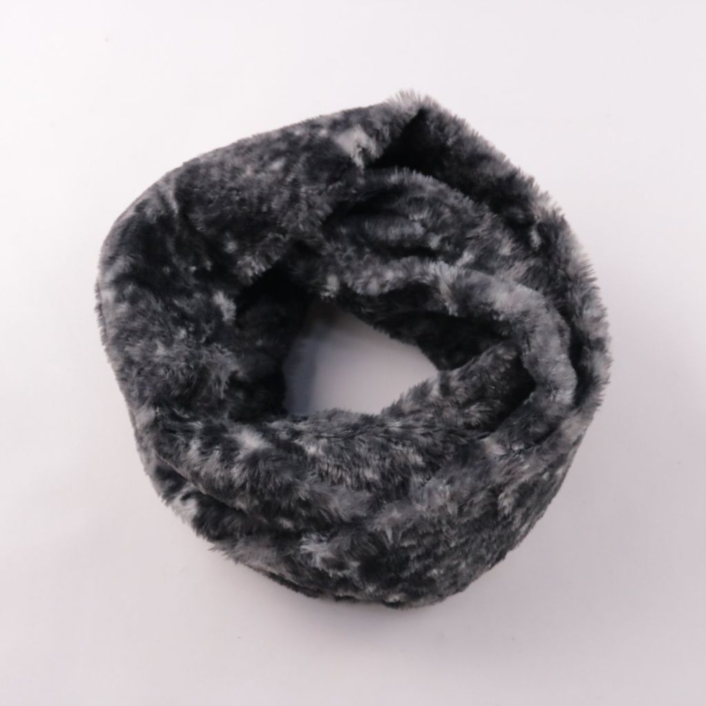 Меховой снуд без бренда, серого меланжевого цвета. Подойдёт для холодной погоды и прогулок, хорошо закрывает шею и защищает от ветра. Удобен тем, что надевается одним движением и не развязывается.