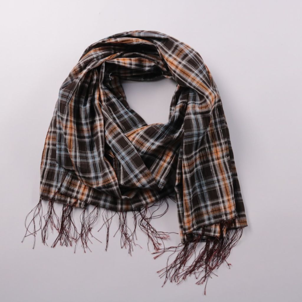 Шарф в клетку с кисточками по краю, выполнен из 100% полиэстера. Подойдёт для повседневной носки в прохладную погоду и легко сочетается с однотонной верхней одеждой. Полиэстер практичен в уходе и быстро сохнет.