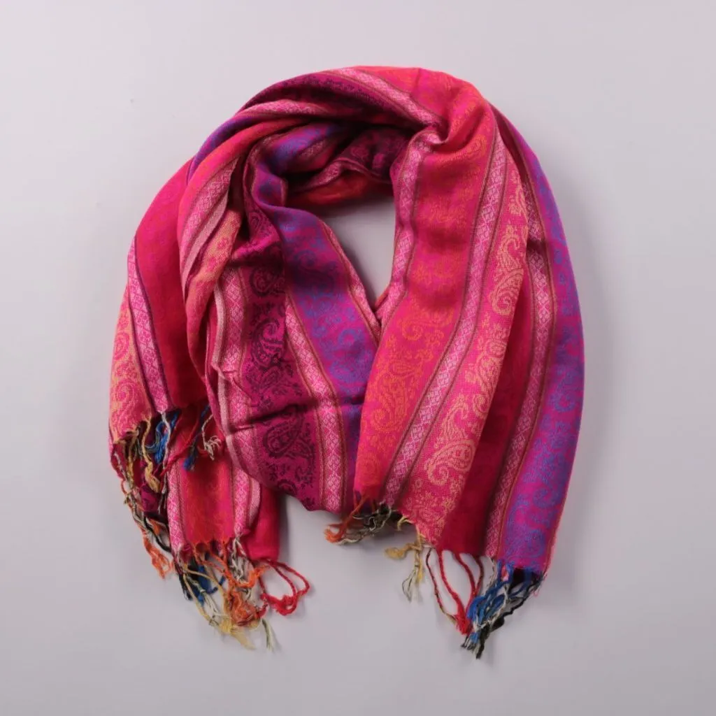 Тканый шарф с бахромой и узором в полоску, без указанного бренда. Подойдёт для повседневных образов в прохладную погоду и как акцент к однотонной одежде. Лёгкий и компактный, удобно носить в сумке.