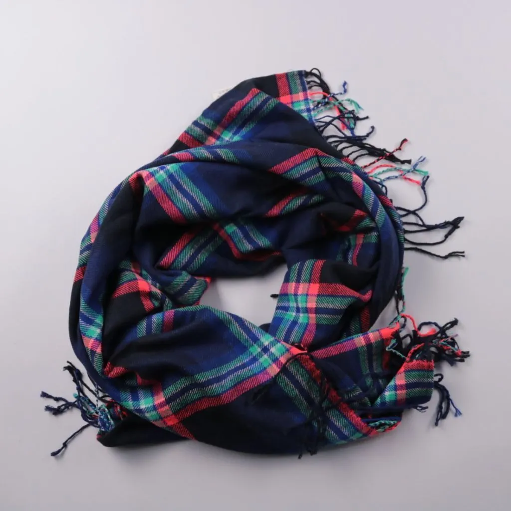 Шарф Old Navy в клетку (тартан) с бахромой по краю. Подойдёт для повседневных образов и прогулок в прохладную погоду, хорошо сочетается с однотонной верхней одеждой. Акриловая пряжа неприхотлива в уходе и быстро сохнет.