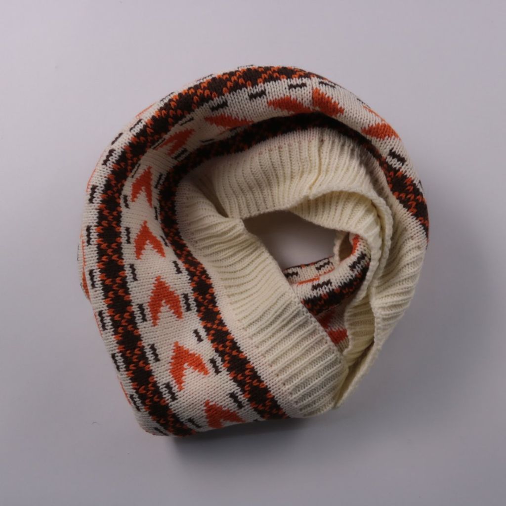 Вязаный шарф-снуд Doetje с орнаментом в бежево-оранжево-чёрной гамме. Подойдёт для зимних прогулок и повседневных образов, удобно носить под куртку или пальто. Акриловая пряжа мягкая и неприхотлива в уходе.