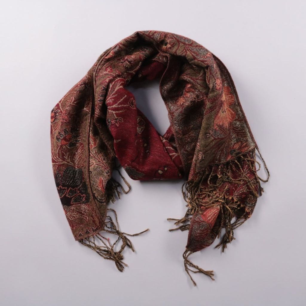 Шарф с цветочным жаккардовым узором и кисточками по краям, без указанного бренда. Подойдёт для повседневных образов в прохладную погоду, чтобы носить на шее или накидывать на плечи. Плотная ткань хорошо драпируется и помогает сохранить тепло.