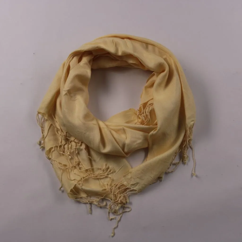 Лёгкий однотонный шарф бежевого цвета с бахромой по краям. Подойдёт для прогулок и офиса в прохладную погоду, легко сочетается с базовой одеждой. Мягко драпируется и добавляет немного тепла без лишнего объёма.