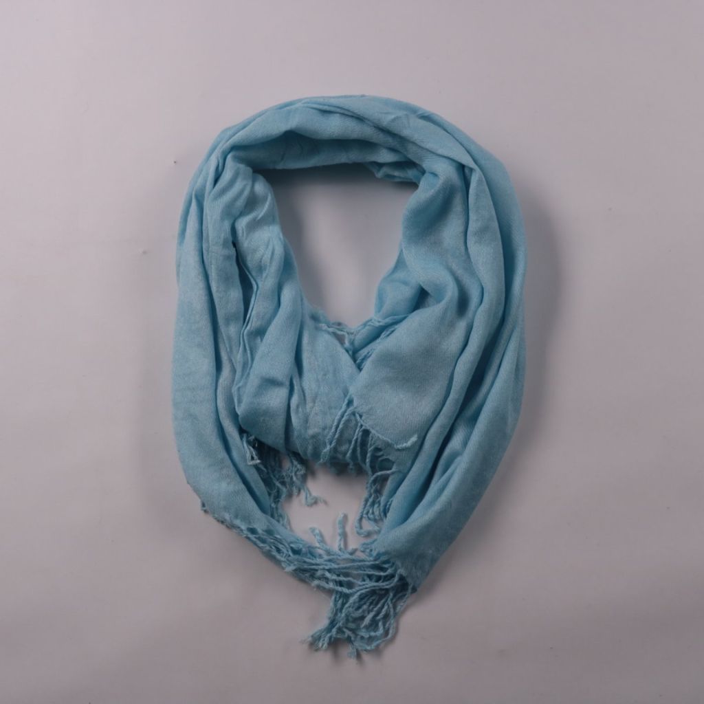 Лёгкий однотонный шарф голубого цвета с бахромой по краю. Подойдёт для прохладной погоды весной и осенью и для повседневных образов. Мягкая ткань легко драпируется и удобно завязывается.