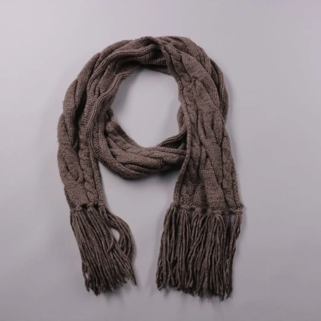 Вязаный шарф с узором «косы» и бахромой, без видимых логотипов. Подойдёт для повседневной носки в холодную погоду, хорошо сочетается с пальто и пуховиком. Плотная вязка помогает лучше сохранять тепло и защищает шею от ветра.