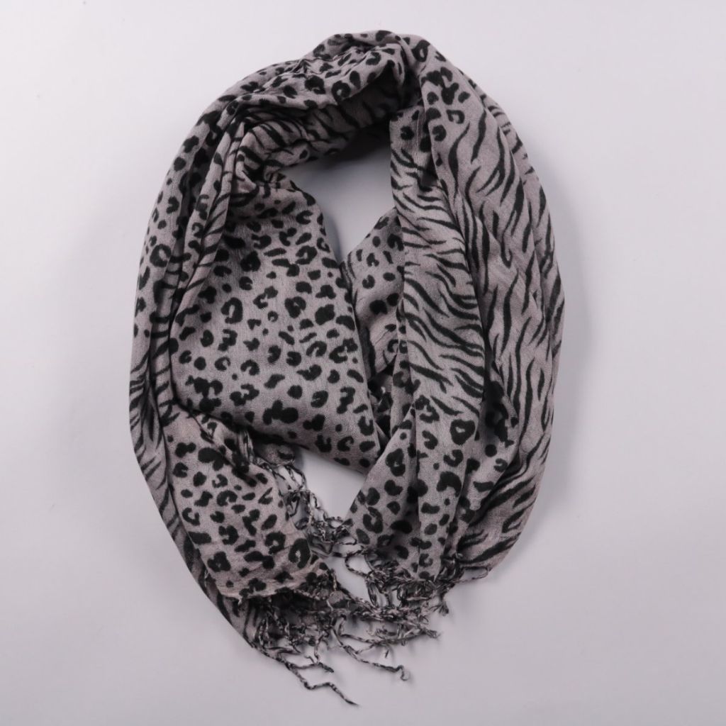 Шарф с анималистичным принтом (леопард/зебра) в серо-чёрной гамме и с бахромой по краю. Подойдёт для повседневных образов и поездок, легко драпируется на шее или на плечах. Практичное преимущество — добавляет акцент образу и может заменить лёгкую накидку.