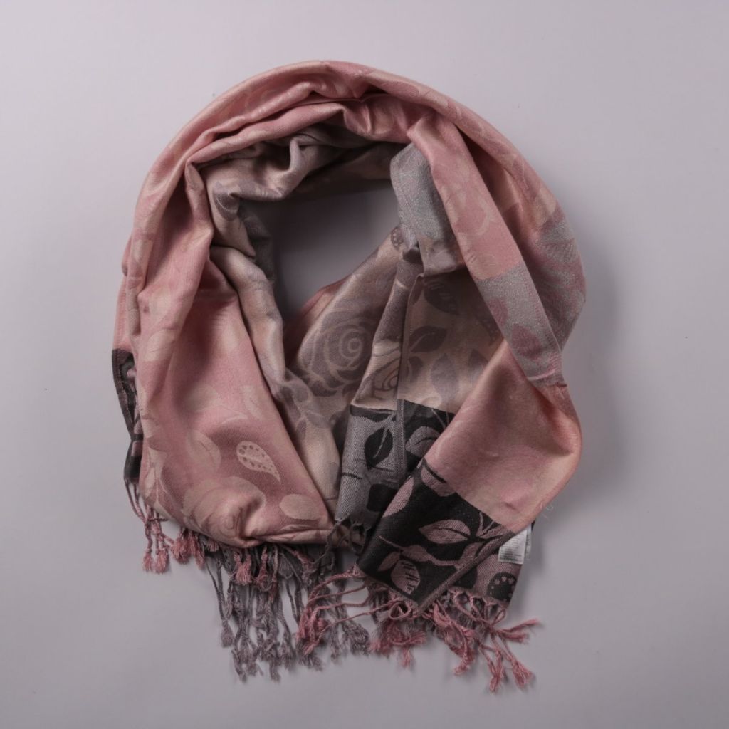 Шарф с цветочным принтом в розово-серой гамме и кисточками по краю. Подойдёт для повседневных образов и как лёгкий акцент на осень/весну. Тонкий материал удобно драпируется и не занимает много места в сумке.
