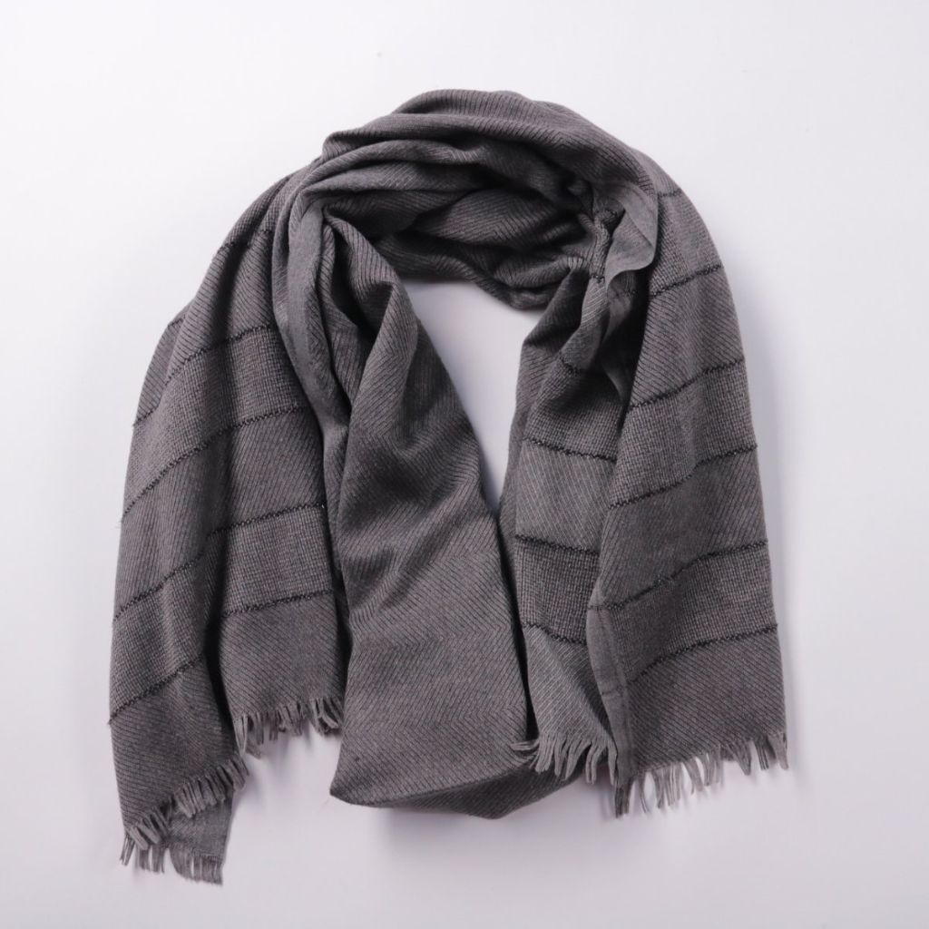 Шарф без указанного бренда в сером цвете, с фактурным плетением и тонкими полосами, по краям — бахрома. Подойдёт для повседневных образов в прохладную погоду, можно носить с пальто или курткой. Лёгкий и достаточно длинный, удобно драпируется и быстро д...
