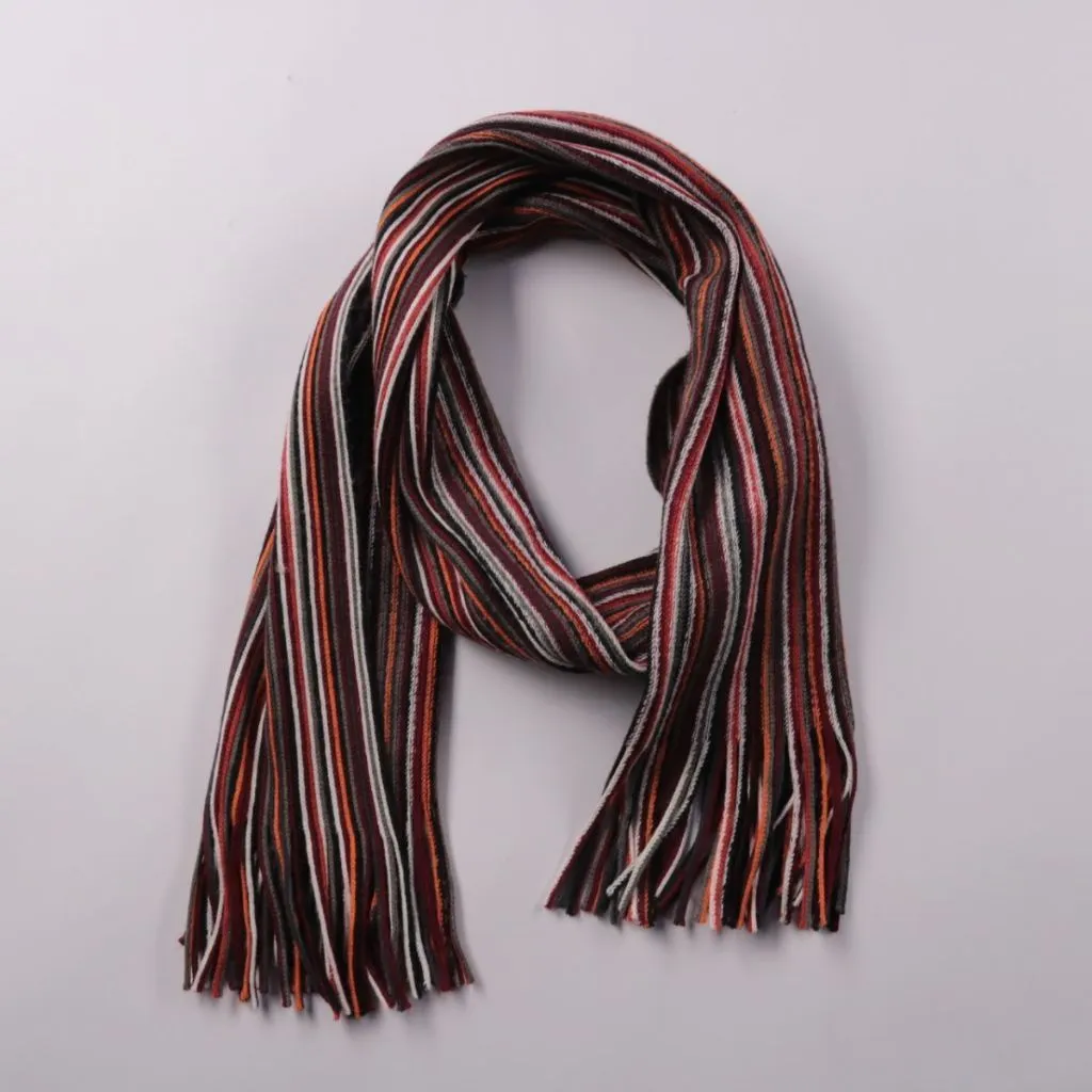 Вязаный шарф в полоску с бахромой по краям. Подойдёт для повседневной носки с пальто или курткой в холодную погоду, хорошо согревает шею.