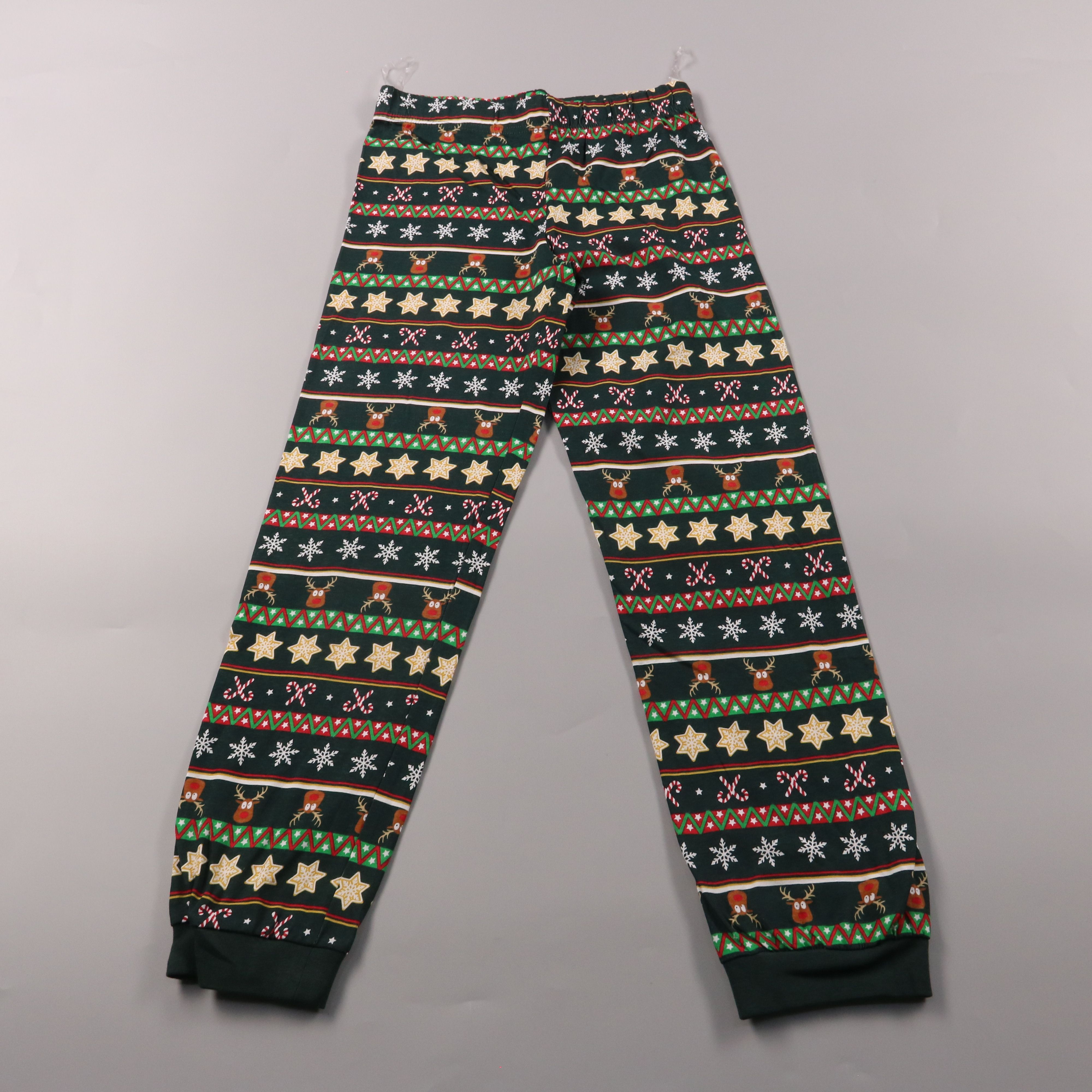 Детские брюки без указанного бренда с новогодним принтом (олени, снежинки и звёзды) и манжетами по низу. Подойдут для дома, прогулок и праздничных зимних дней. Эластичный пояс обеспечивает удобную посадку и не сковывает движения.