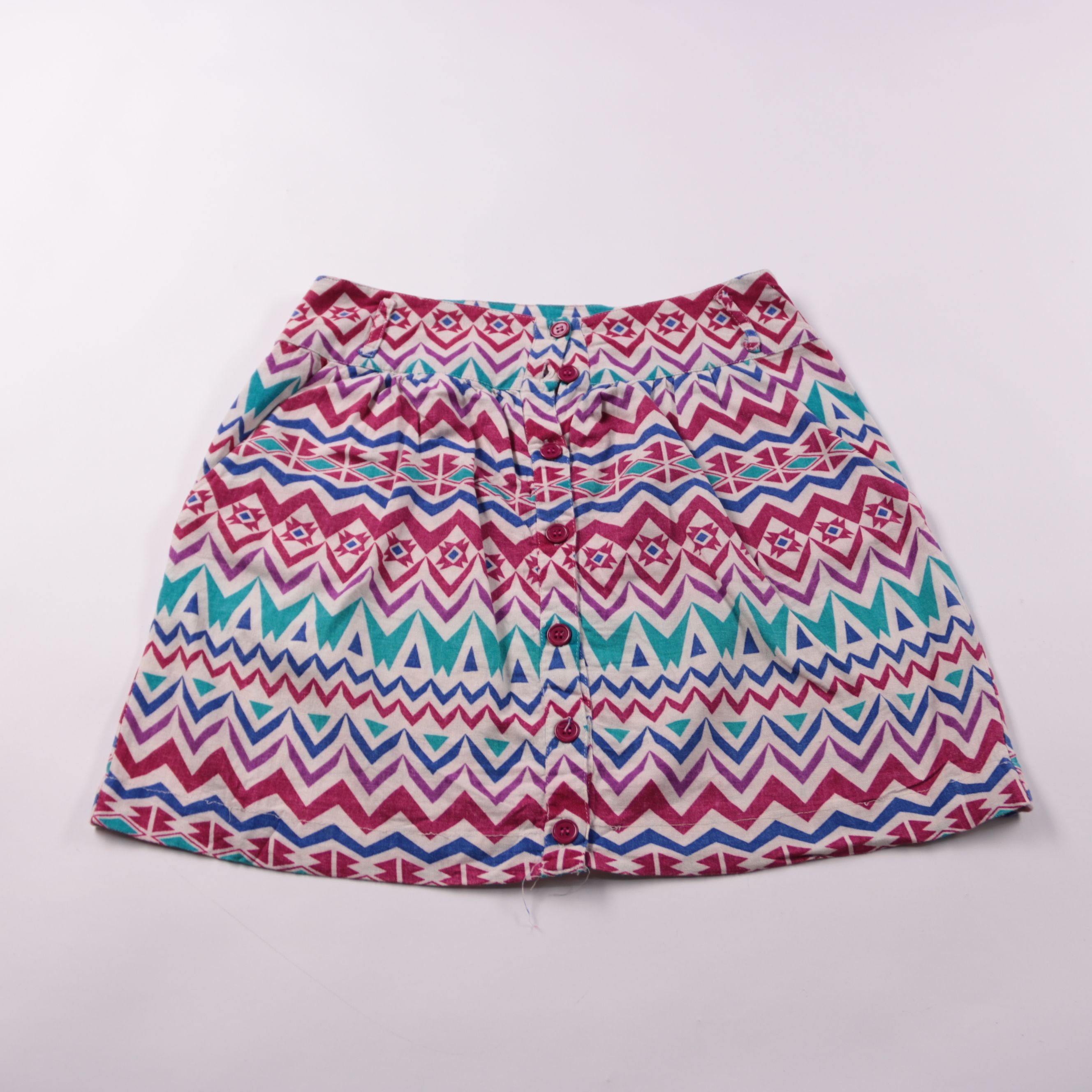 Детская юбка с ярким геометрическим принтом (зигзаг) и застёжкой на пуговицы спереди. Подойдёт для повседневной носки летом и в тёплую погоду. Лёгкая ткань и пуговицы позволяют быстро надевать и снимать.