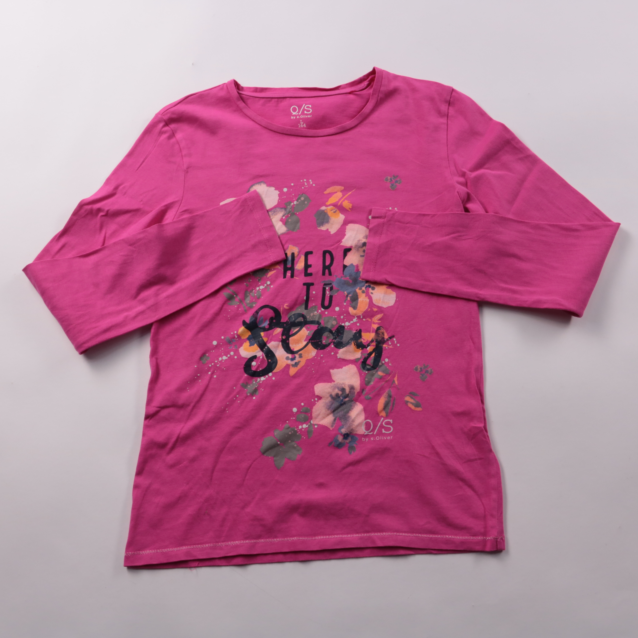 Кофта Q/S by s.Oliver ярко-розового цвета с длинным рукавом и цветочным принтом спереди. Подойдёт для школы и повседневной носки в прохладную погоду, удобно комбинируется с джинсами и юбками. Натуральный хлопок приятен к телу и хорошо дышит.