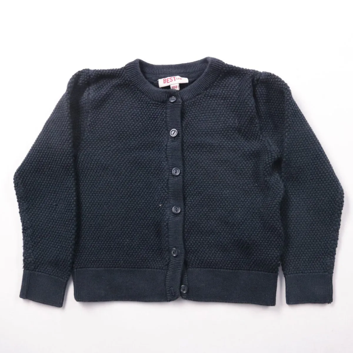 Вязаный кардиган BESTies тёмно-синего цвета на пуговицах, с круглым вырезом и длинным рукавом. Подойдёт для детского сада и школы, удобно надевать поверх футболки или платья. Практичен тем, что легко сочетать с разной одеждой и быстро снимать/надевать благодаря застёжке.