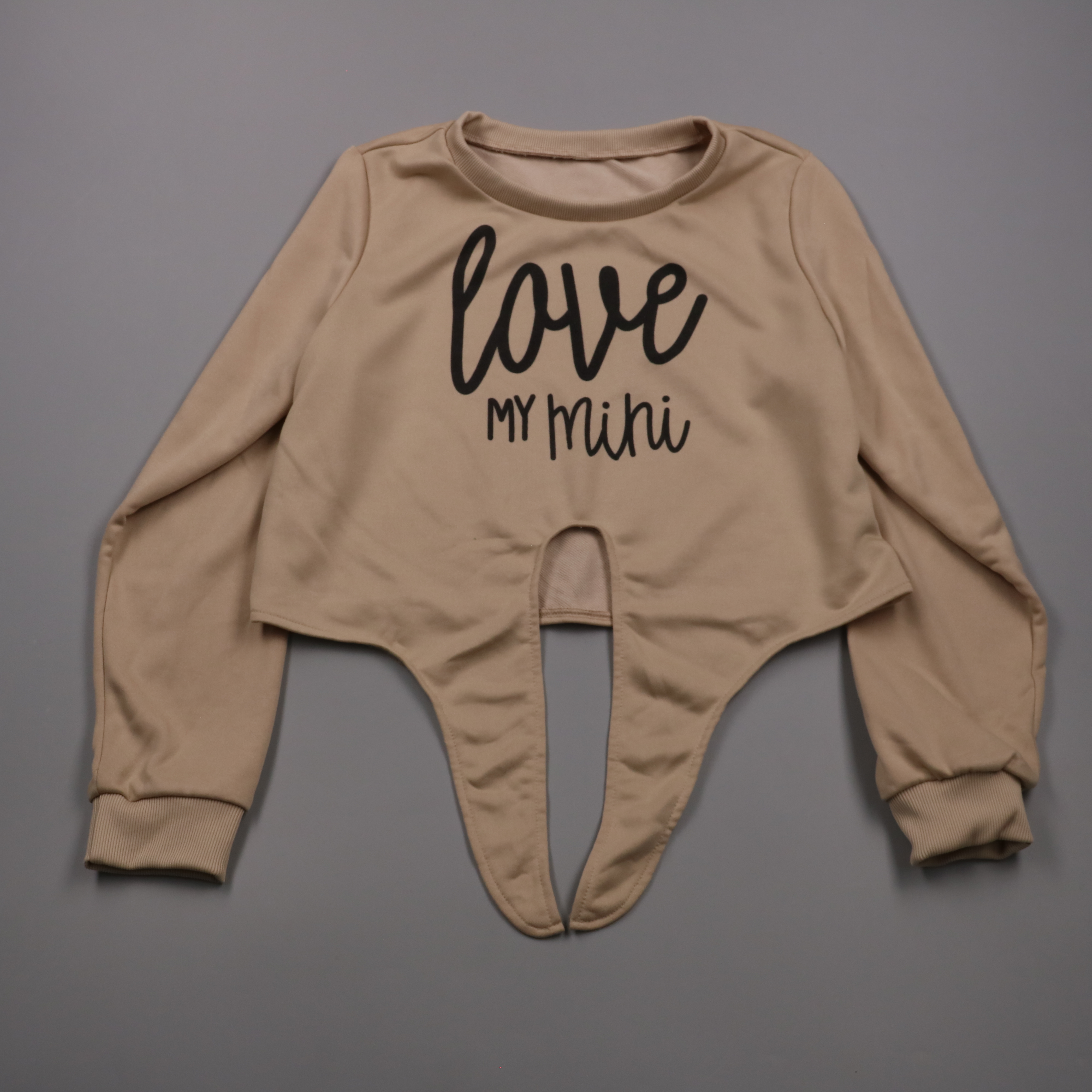 Толстовка для девочки бежевого цвета с принтом «love my mini» и оригинальным низом с двумя удлинёнными деталями. Подойдёт для повседневной носки и фотосессий в прохладную погоду. Ткань из полиэстера легко стирается и быстро сохнет.