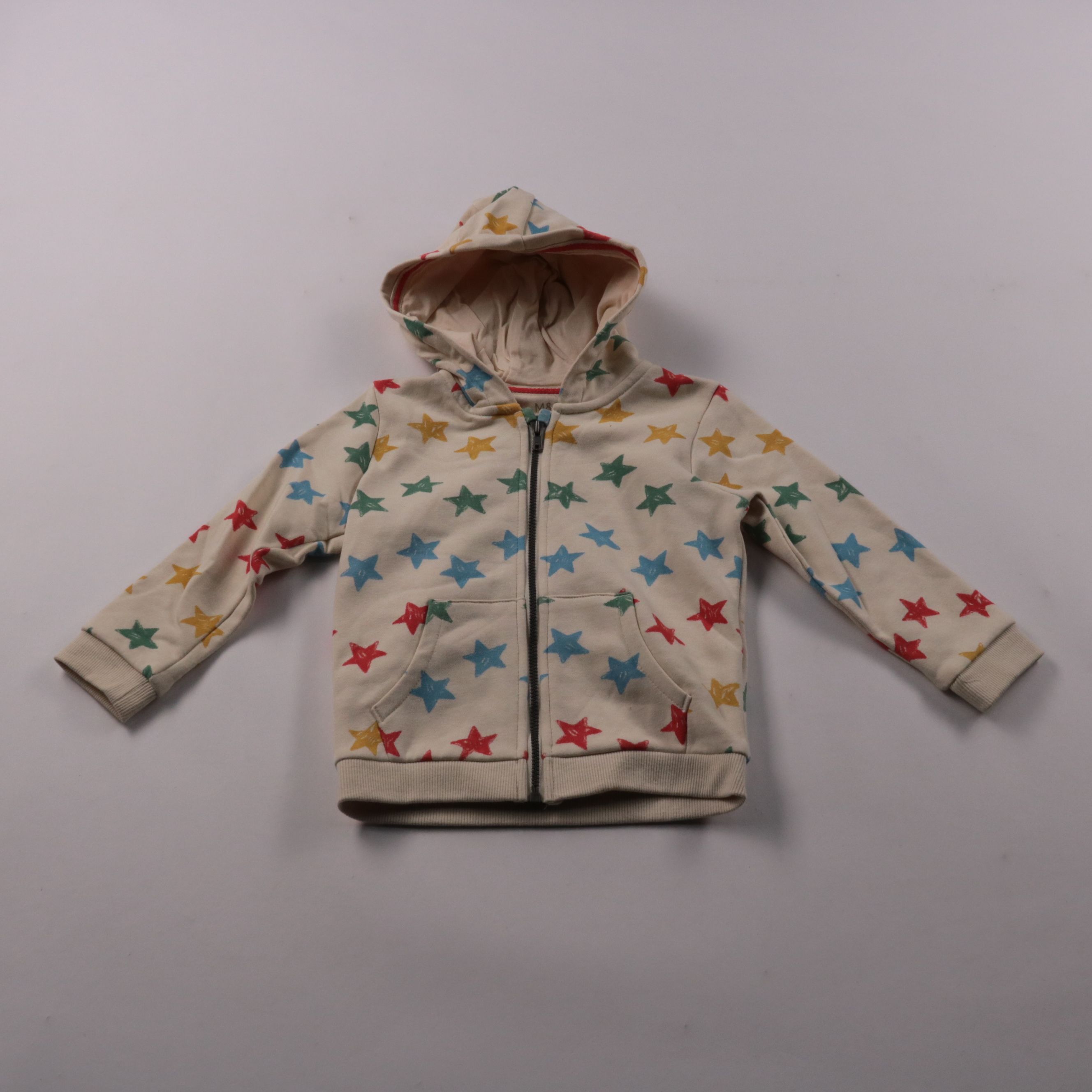 Толстовка M&S на молнии с капюшоном и карманами, в бежевом цвете с разноцветными звёздами. Подойдёт для прогулок и садика в прохладную погоду, размер по бирке 18–24 месяца. Удобно быстро надевать и снимать благодаря застёжке-молнии.