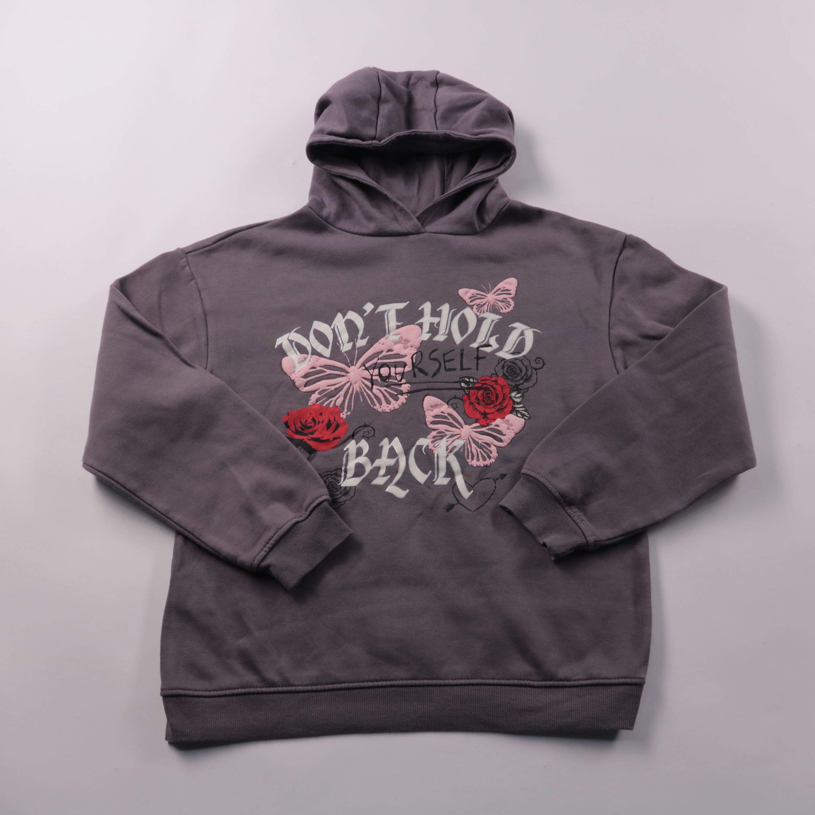 Худи Primark серого цвета с принтом бабочек и роз и капюшоном. Подойдёт для школы и прогулок в прохладную погоду, удобно комбинируется с джинсами или спортивными брюками. Мягкая внутренняя сторона сохраняет тепло и комфорт при носке.