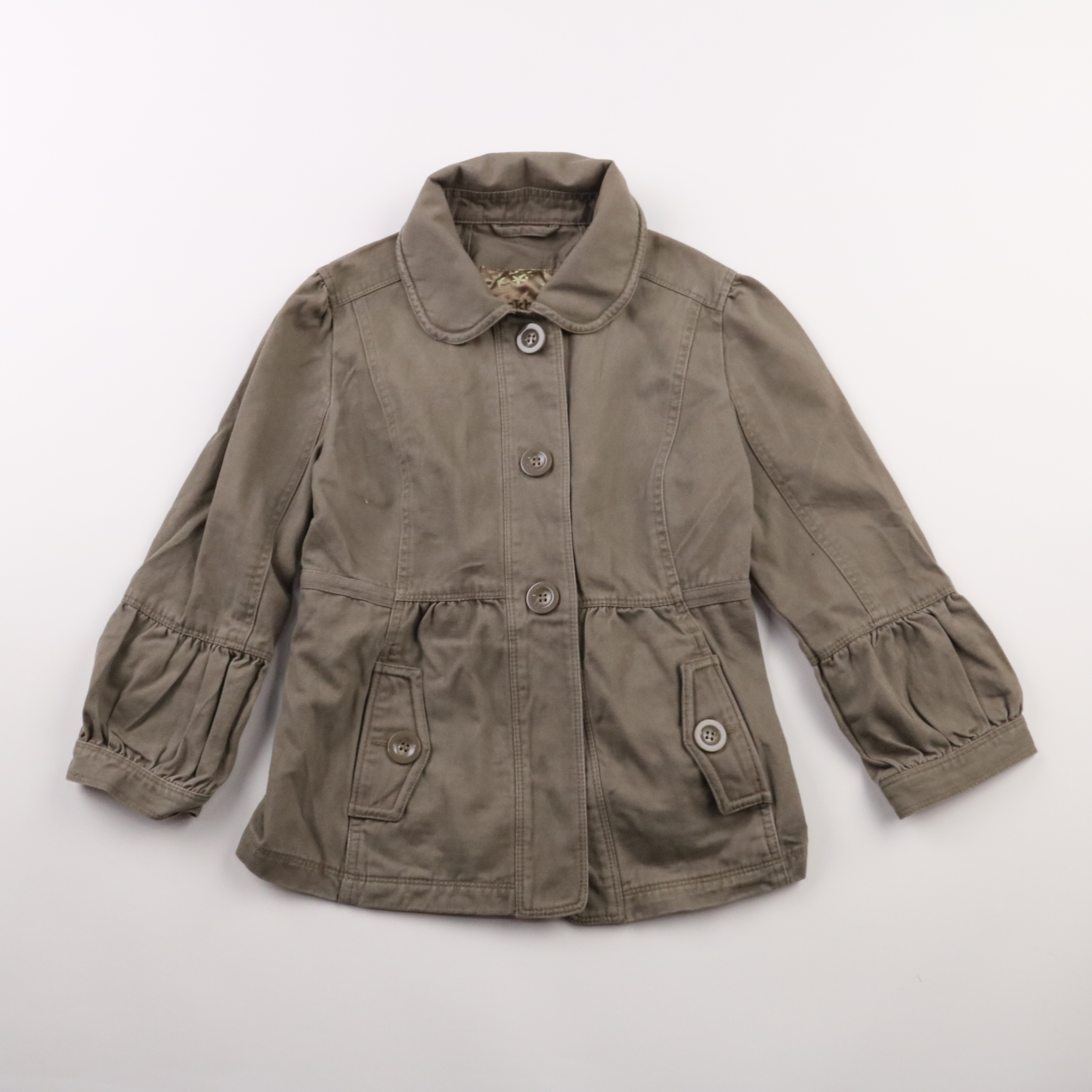 Демисезонная куртка Clockhouse цвета хаки с воротником и застёжкой на пуговицы, снизу и на рукавах лёгкая сборка. Подойдёт для прогулок весной и осенью, хорошо сочетается с джинсами и платьями. Плотный хлопок практичен в уходе и комфортен в носке.