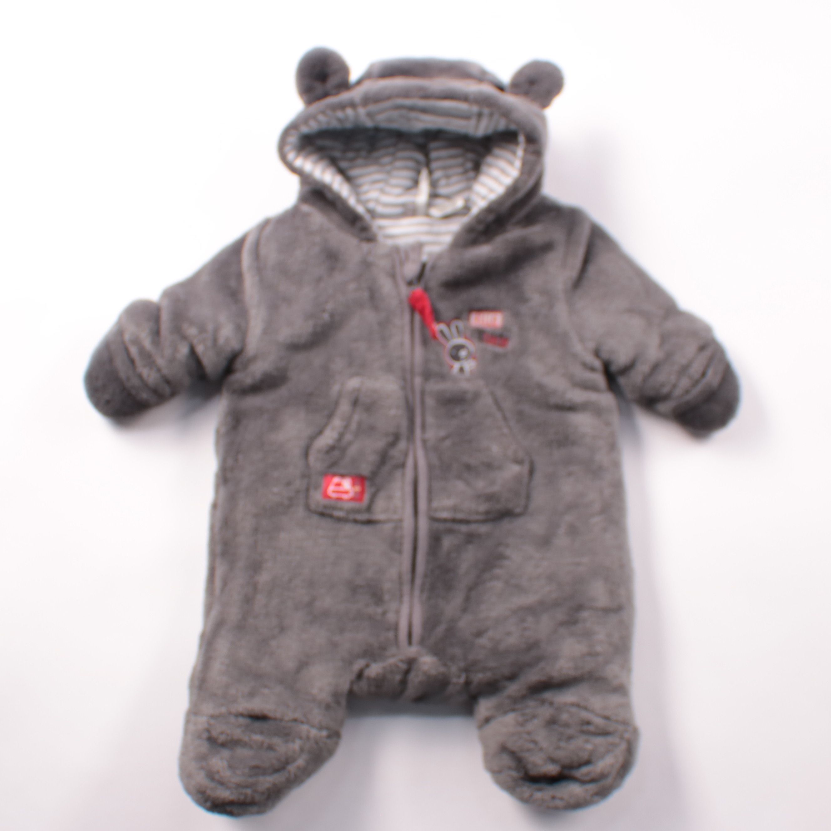 Мягкий плюшевый комбинезон Kiabi серого цвета с капюшоном с ушками и застёжкой на молнию. Подойдёт малышу для дома и сна, а также для прогулок в коляске в прохладную погоду. Ткань приятная к телу и быстро надевается за счёт молнии.