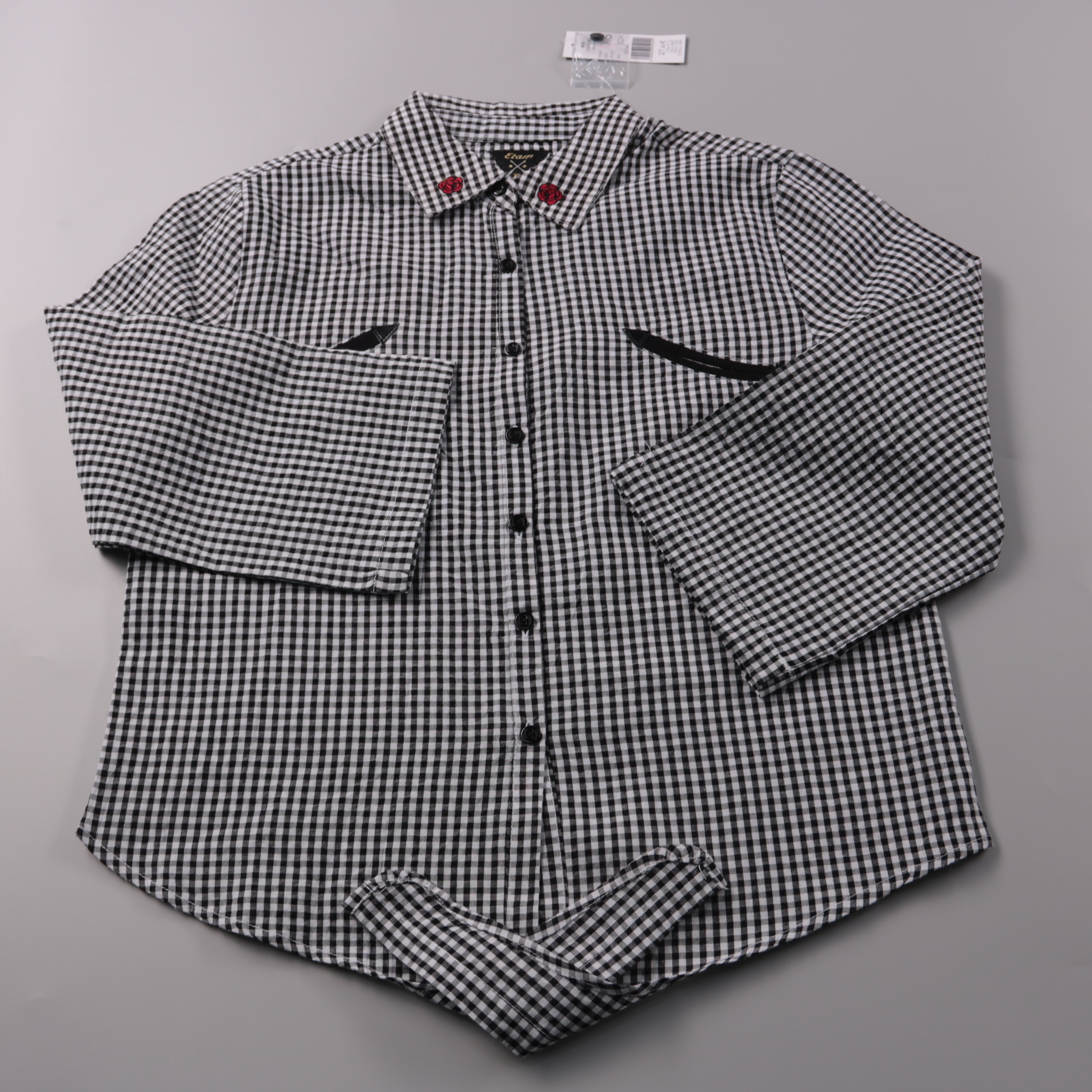 Рубашка Etam в чёрно-белую клетку, с длинным рукавом и застёжкой на пуговицы. Подойдёт для школы, праздника или повседневной носки, легко сочетается с джинсами и брюками. Практичная ткань с добавлением полиэстера меньше мнётся и проще в уходе.