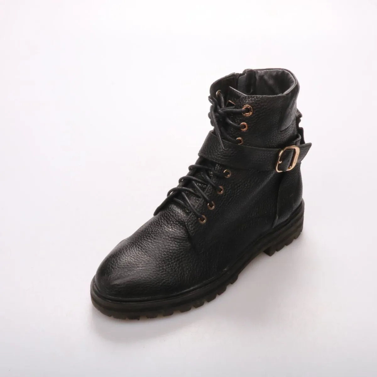 Мужские ботинки MGXX из чёрной фактурной кожи на шнуровке, с боковой молнией и ремешком на пряжке. Подойдут на каждый день в городе в межсезонье и прохладную погоду. Рельефная подошва даёт более уверенное сцепление на мокрых и скользких покрытиях.