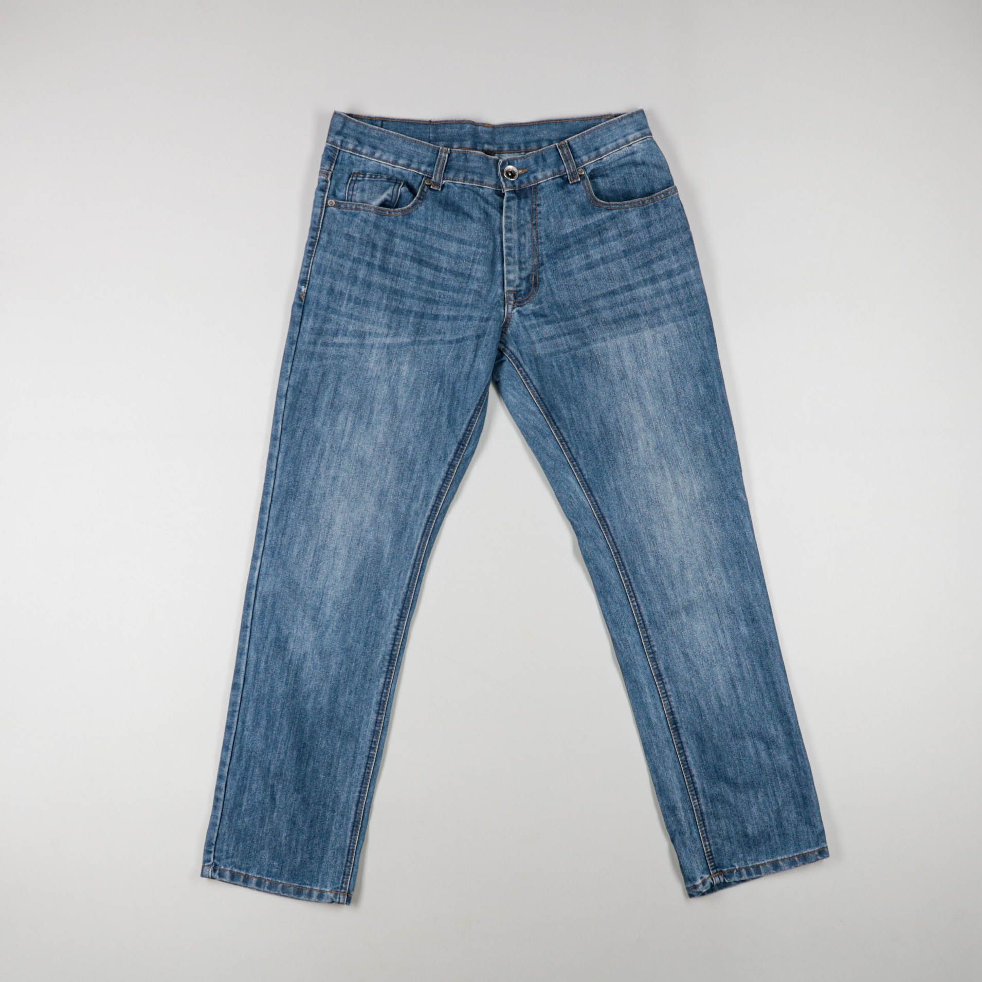 Мужские джинсы классического синего цвета с лёгкими потёртостями. Подойдут для повседневной носки и неформальных образов. Плотный деним хорошо держит форму и сочетается с любой обувью.