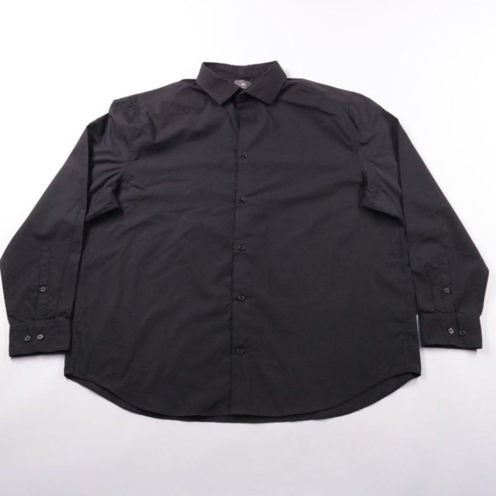 Мужская рубашка H&M Regular Fit в классическом чёрном цвете с длинным рукавом и застёжкой на пуговицы. Подойдёт для офиса, мероприятий и повседневных образов в стиле smart casual. Ткань с добавлением полиэстера меньше мнётся и проще в уходе.