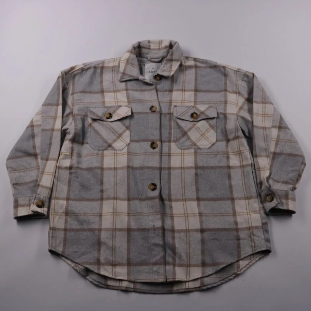 Мужская рубашка-оверсайрт ADPT. в серо-бежевую клетку, застёжка на пуговицах и два нагрудных кармана с клапанами. Подойдёт для повседневной носки в прохладную погоду, можно носить как верхний слой поверх футболки. Практичный материал хорошо держит форм...