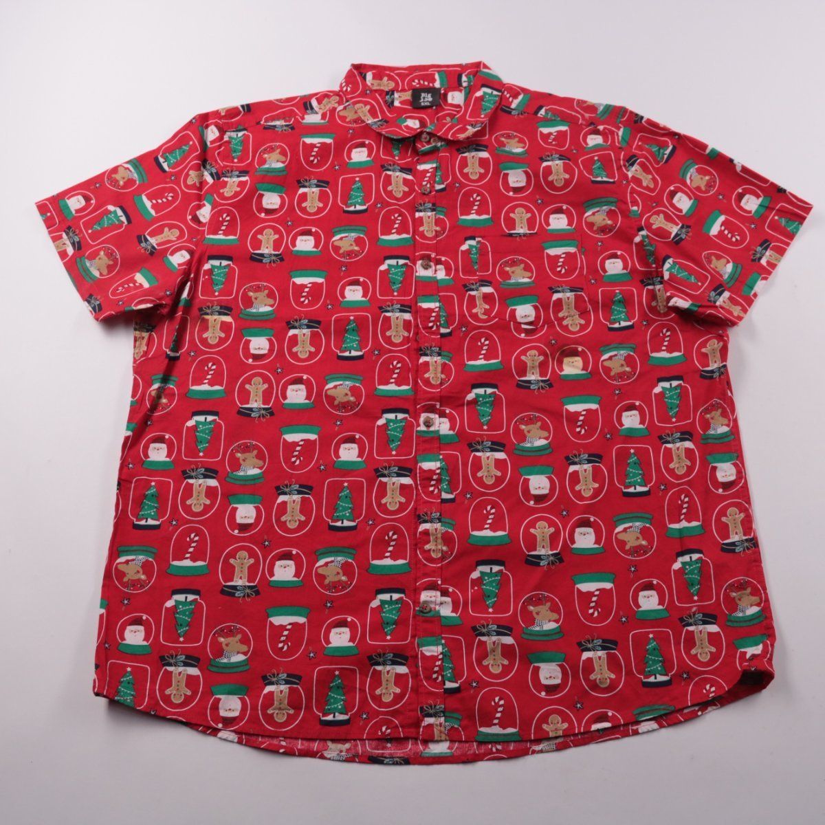 Мужская рубашка Big Joe с коротким рукавом и ярким новогодним принтом на красном фоне. Подойдёт для повседневной носки летом и для тематических праздников. Натуральный хлопок хорошо дышит и комфортен в жару.