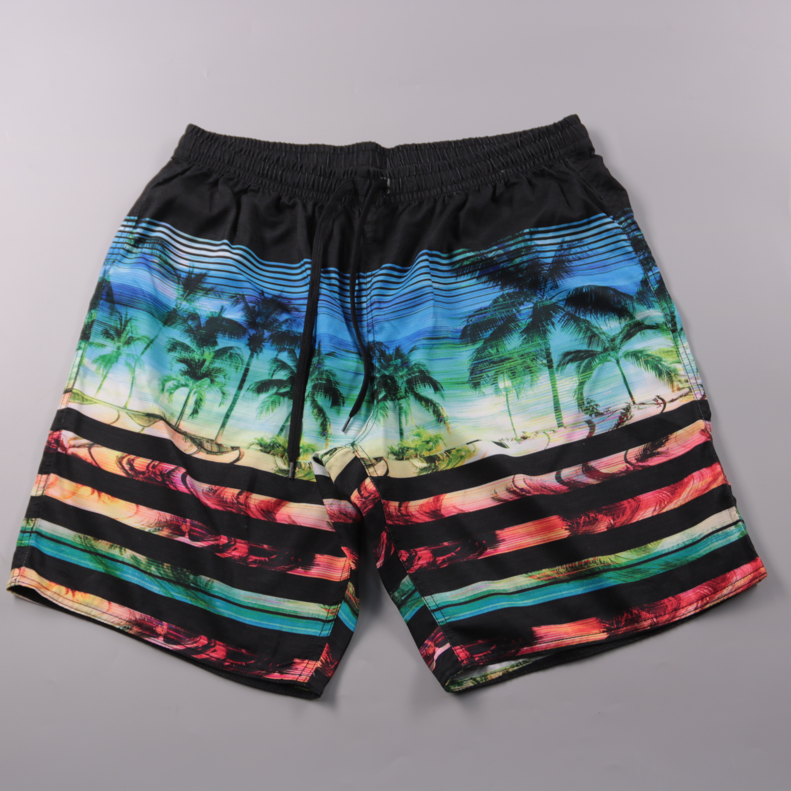 Пляжные шорты с ярким принтом пальм и полос, на эластичном поясе со шнурком. Подойдут для отдыха, бассейна и прогулок в жаркую погоду. Быстро сохнут и удобно регулируются по талии.