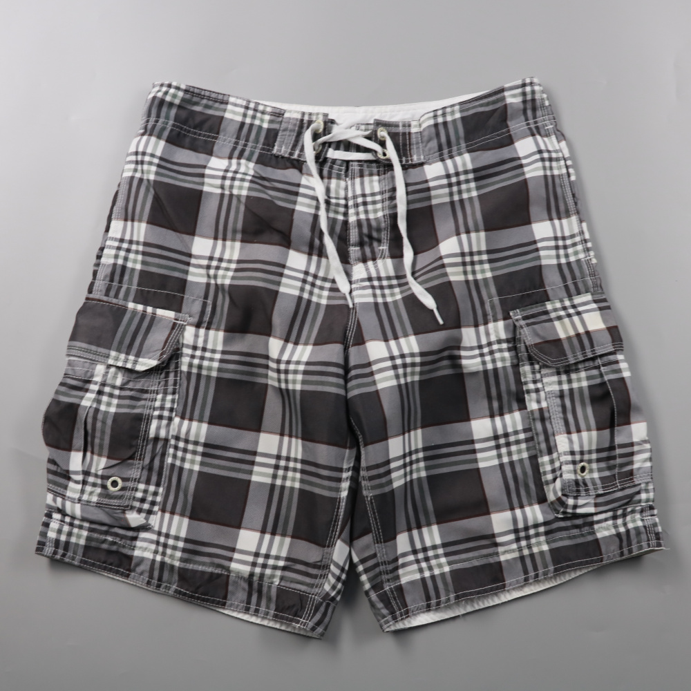 Пляжные шорты Zara Swimwear в серо-белую клетку, с утяжкой на шнурке и сетчатой подкладкой. Подойдут для пляжа, бассейна и отдыха в жаркую погоду. Практичный плюс — вместительные боковые карманы с клапанами.