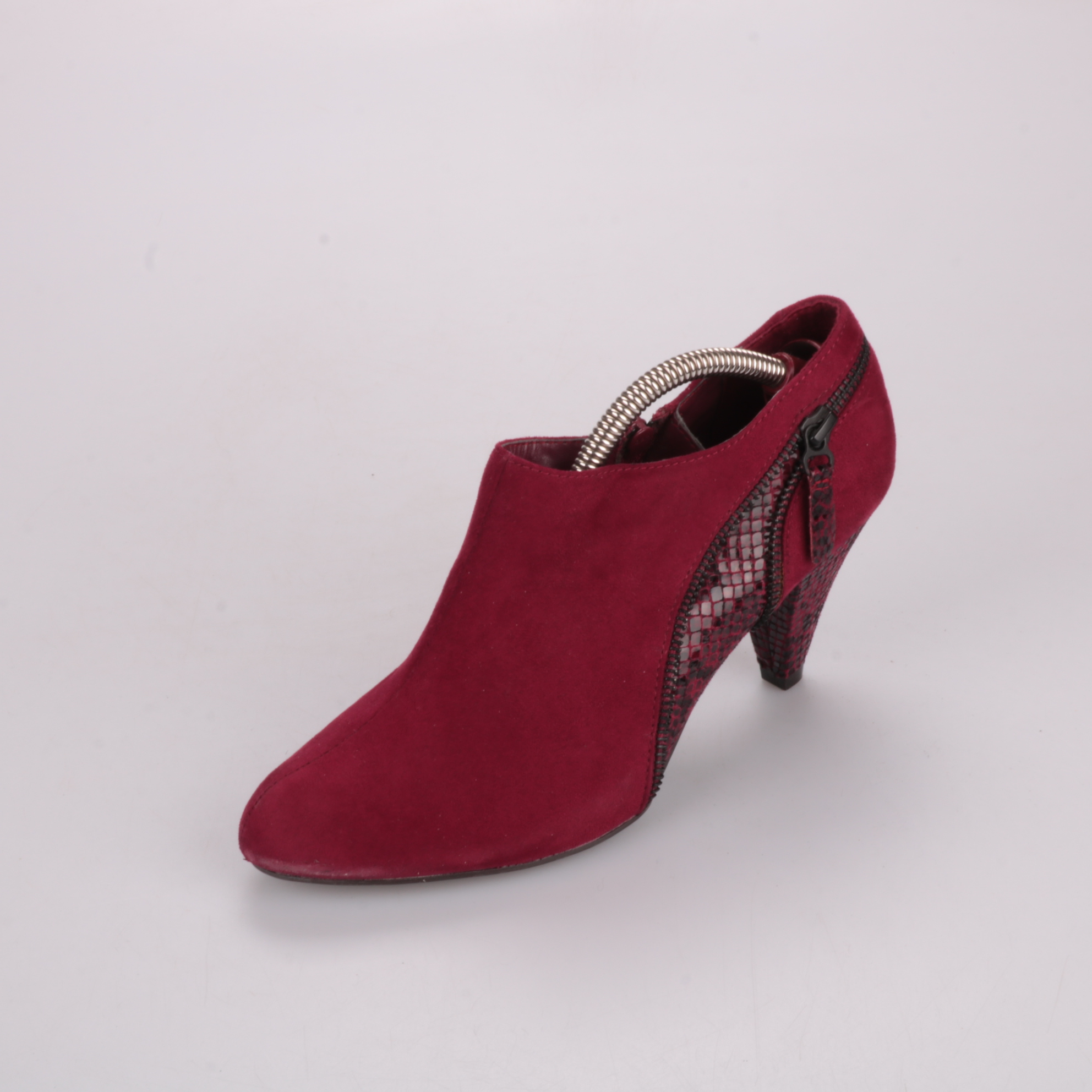 Бордовые ботильоны из мягкой замши с боковой молнией и вставками под рептилию на пятке. Подойдут для осени/весны и образов на выход или в офис с платьем, юбкой или брюками. Устойчивый каблук и удобная посадка на молнии позволяют быстро обуваться и комф...