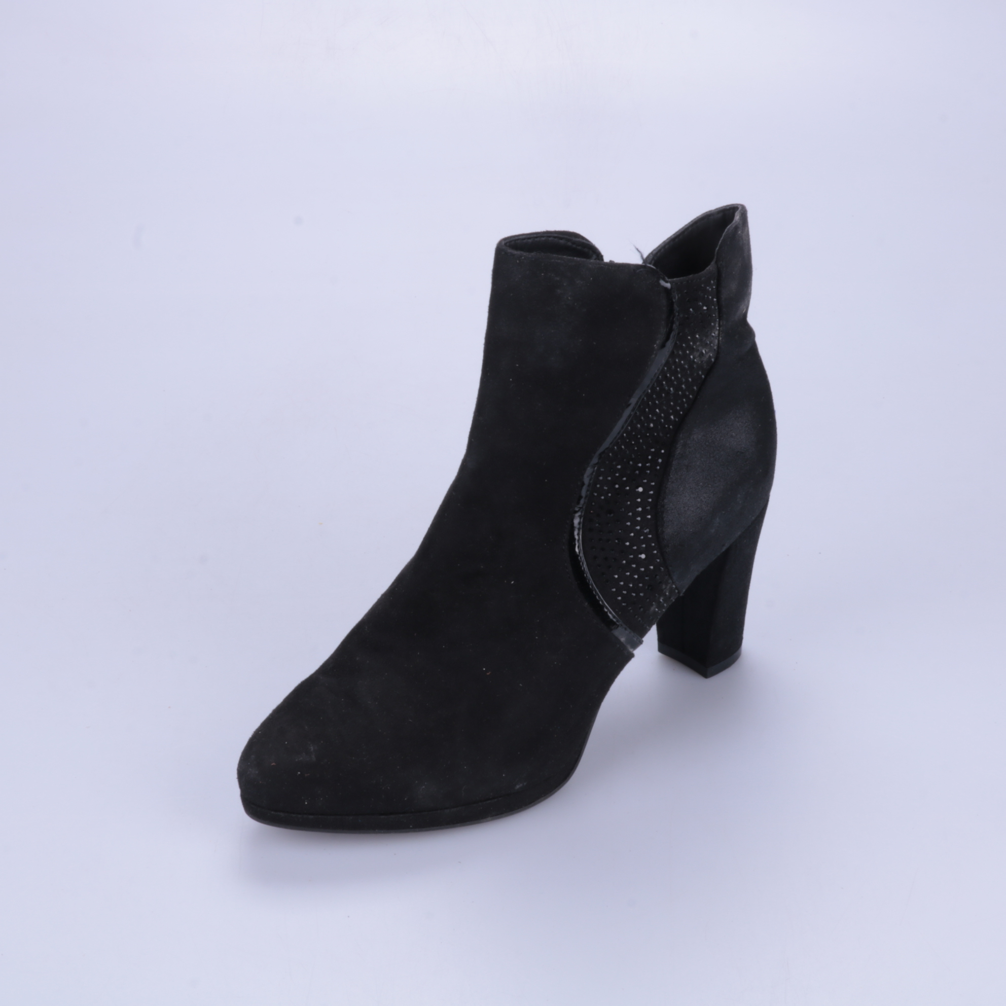Чёрные ботильоны на устойчивом каблуке, с молнией сбоку и декоративной перфорированной вставкой. Подойдут для офиса и повседневных образов в прохладную погоду. Каблук удобный и устойчивый, поэтому в них комфортно ходить весь день.