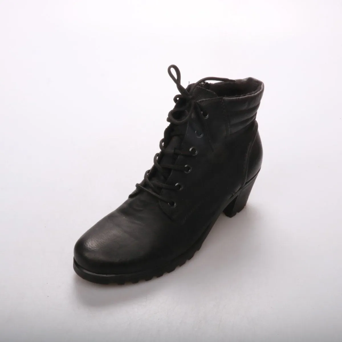 Женские ботильоны Rieker чёрного цвета на устойчивом каблуке, со шнуровкой и боковой молнией. Подойдут на каждый день в демисезон — с джинсами, брюками или платьем. Практичный плюс: рельефная подошва даёт более уверенное сцепление и удобна для ходьбы.