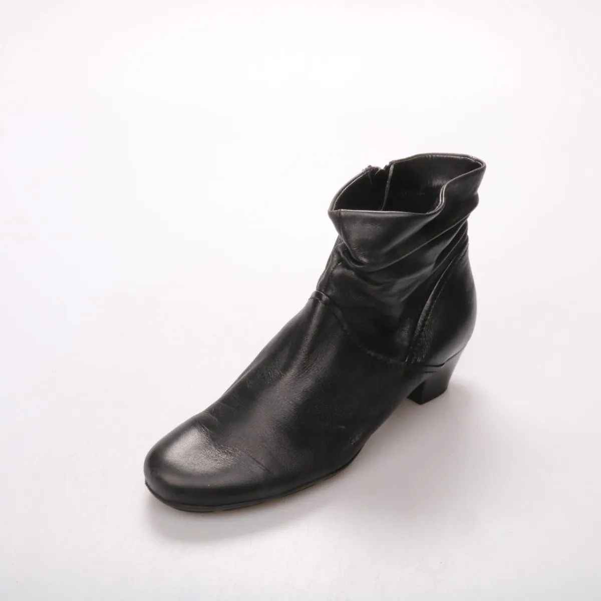 Женские ботильоны Gabor из чёрной кожи на устойчивом невысоком каблуке, с удобной боковой молнией. Подойдут для повседневных городских образов в демисезон и на работу. Практичный плюс — мягкая кожа и комфортная колодка, обувь легко надевать и снимать.