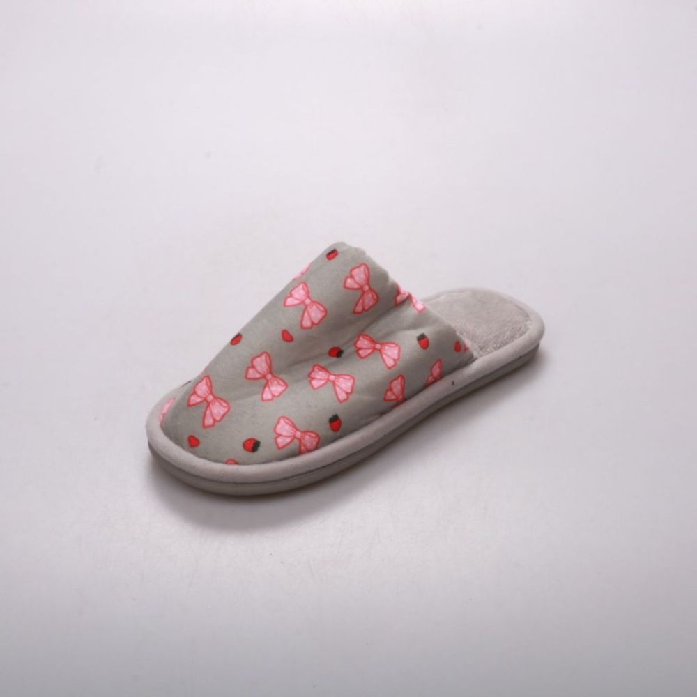 Домашние тапочки без бренда, серые с принтом бантиков. Подойдут для дома и отдыха, мягкая внутренняя часть делает их комфортными для ежедневной носки. Лёгкая подошва помогает не скользить на гладком полу.