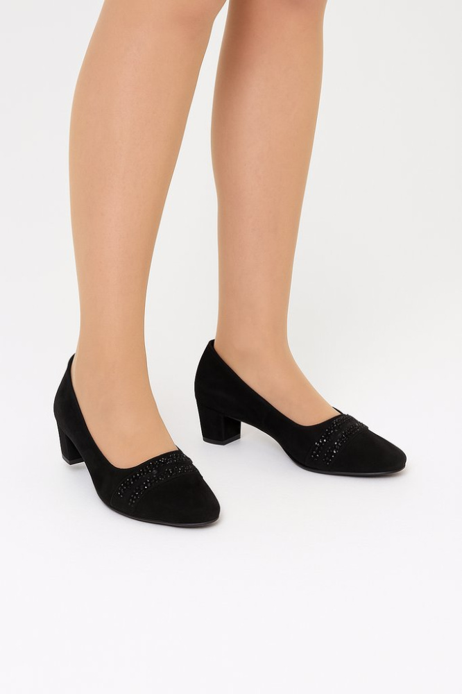 Туфли Gabor comfort из чёрного материала с декоративной вставкой из мелких страз на мысе и устойчивым каблуком. Подойдут для офиса и повседневных выходов, когда нужен аккуратный и сдержанный образ. Рифлёная подошва помогает меньше скользить на гладких ...
