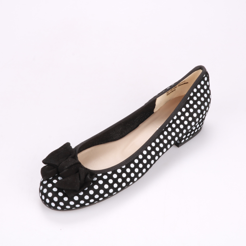 Туфли Alba Moda из текстиля в чёрно-белый горох с декоративным бантом спереди и невысоким устойчивым каблуком. Подойдут для повседневных летних образов и офисного дресс-кода. Лёгкие и удобные для долгой ходьбы.