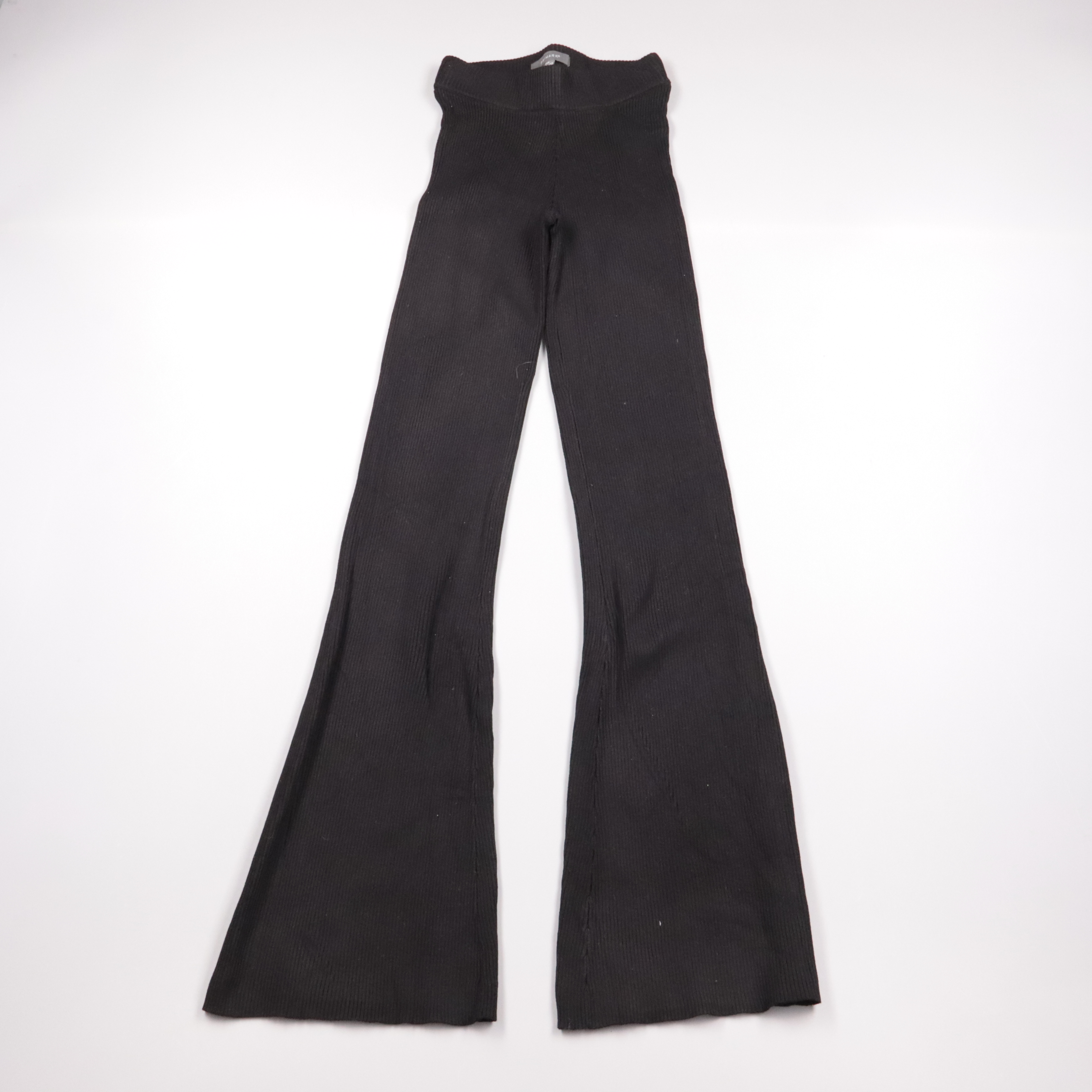 Трикотажные брюки Primark в рубчик чёрного цвета с высокой посадкой и расклешёнными штанинами. Подойдут для повседневных образов и вечерних выходов с топом или свитером. Эластичный пояс без застёжек делает посадку удобной и не сковывает движения.